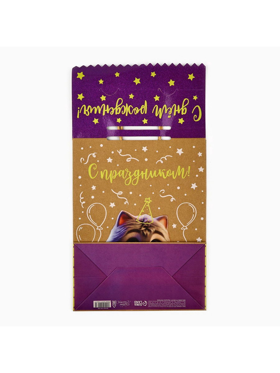 Пакет с клапаном "С Днём рождения", котик, крафт, глиттер, 19.5 x 10 x 25 см, 10x19.5x25.2 см., Дарите Счастье, Китай