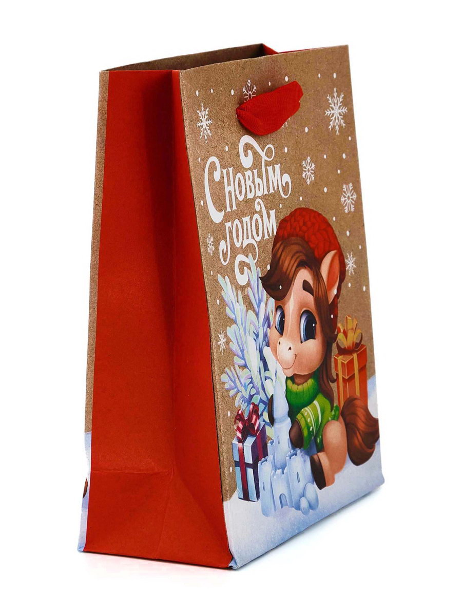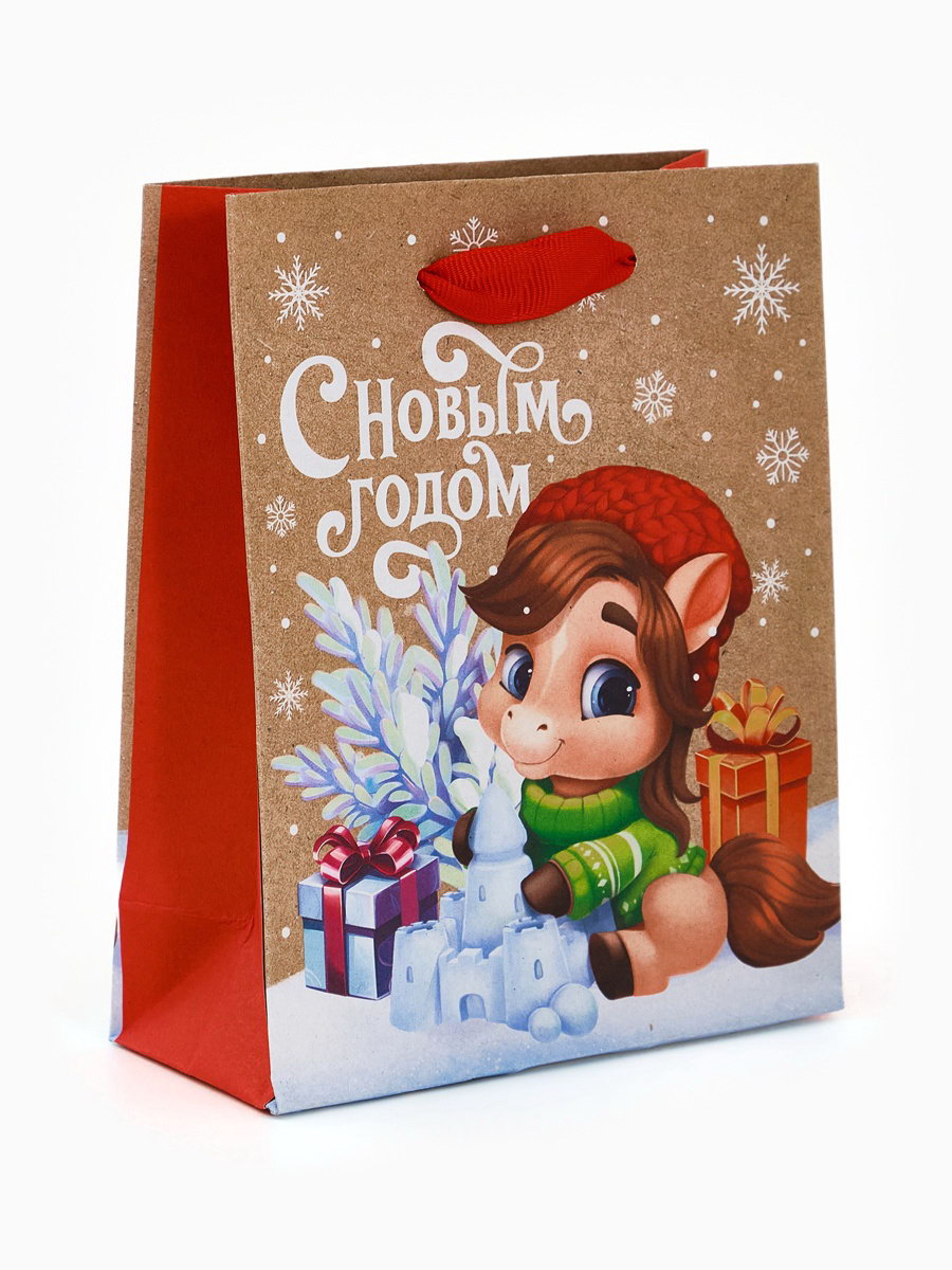 Пакет новогодний крафтовый подарочный "С Новым годом 2026", лошадь, S 12x15x5.5 см, 5.5x12x15 см., Дарите Счастье, Китай