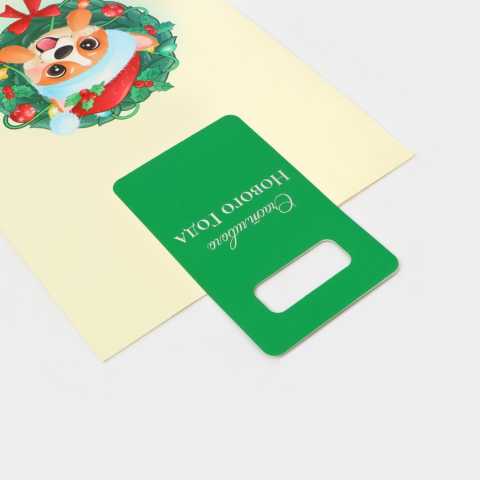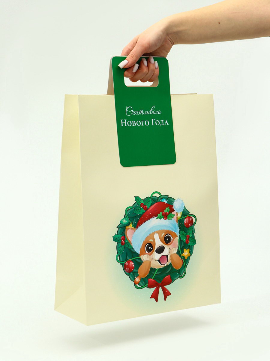 Пакет подарочный с вырубной ручкой "Новогодний корги" 30x40x12 см, зеленый, UPAK LAND, Китай