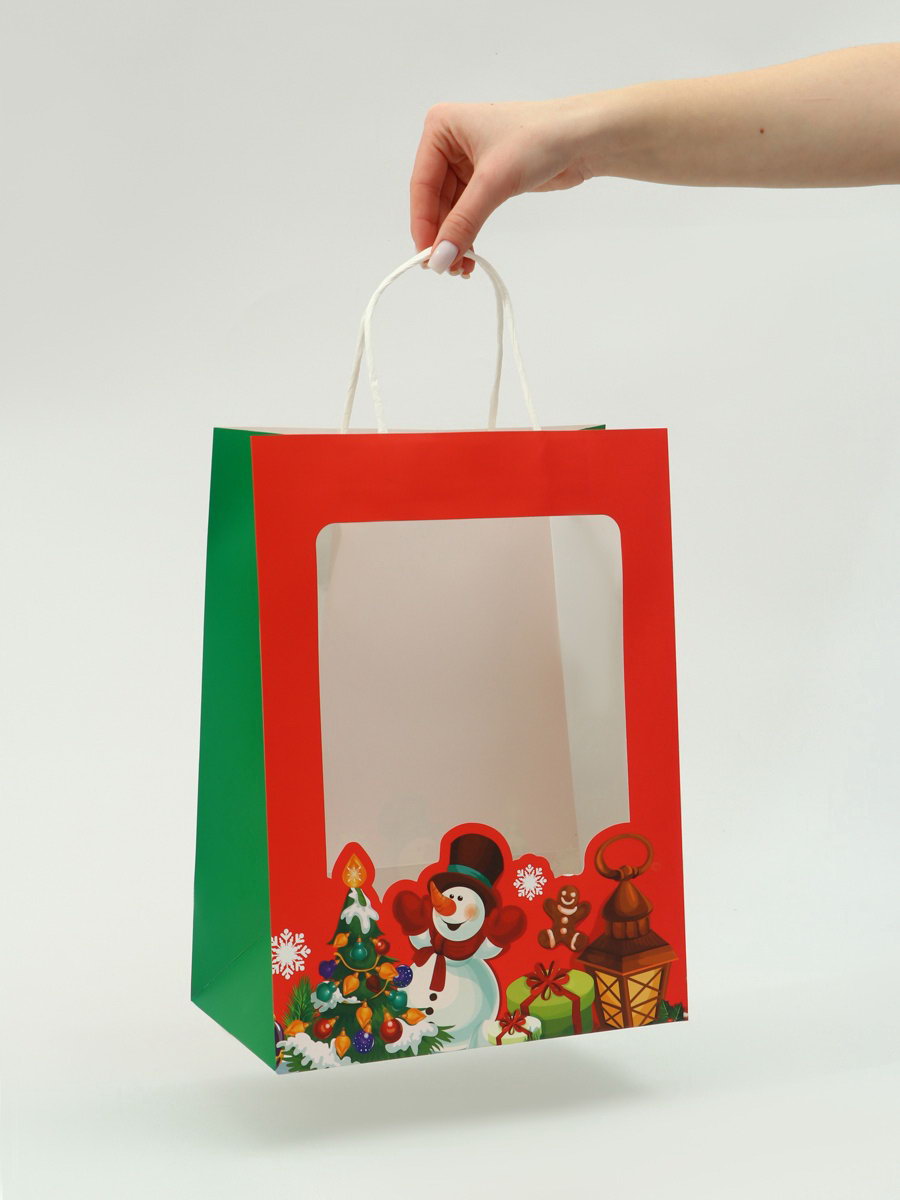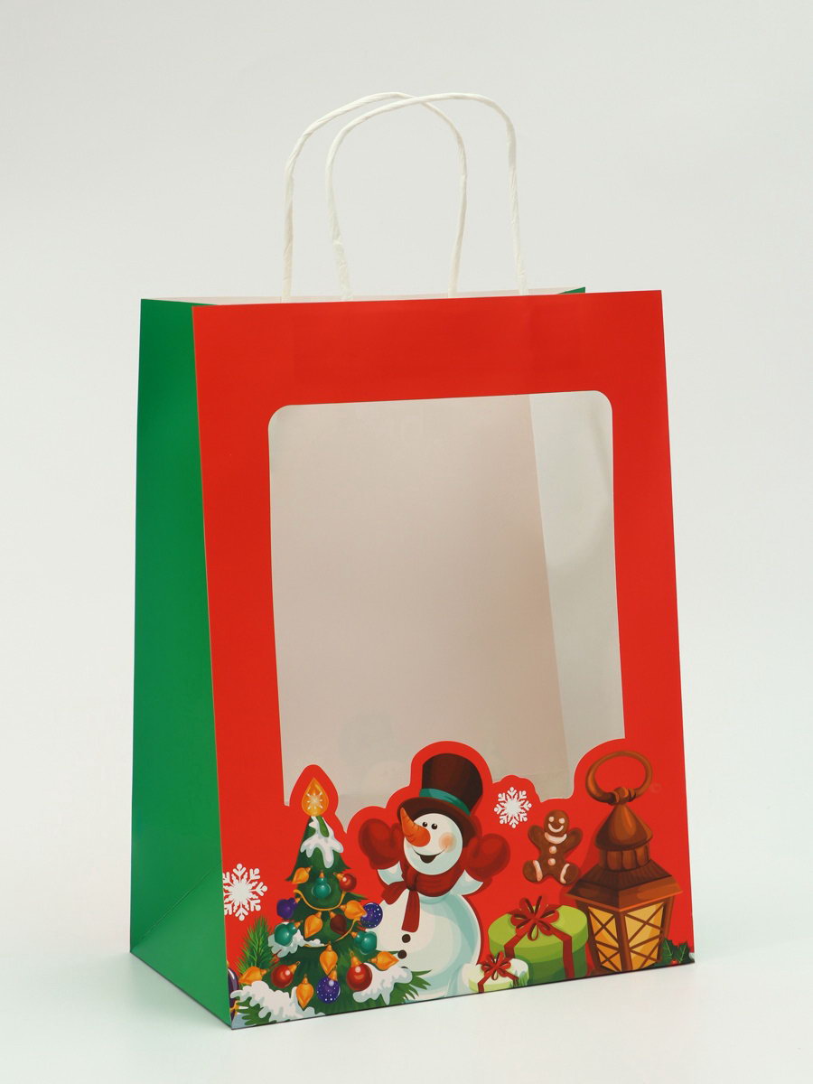 Пакет подарочный бумажный с окном "Снеговик" 26x35x16 см, крафт красный, UPAK LAND, Китай