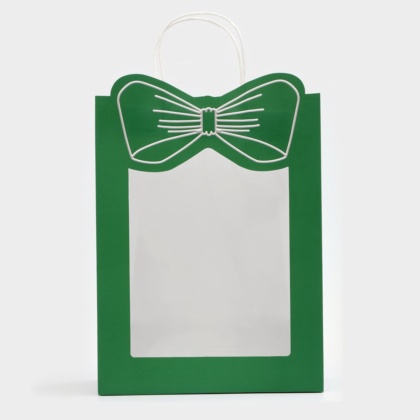 Пакет подарочный бумажный с окном "Бант", 26x35x15 см, крафт зеленый, UPAK LAND, Китай