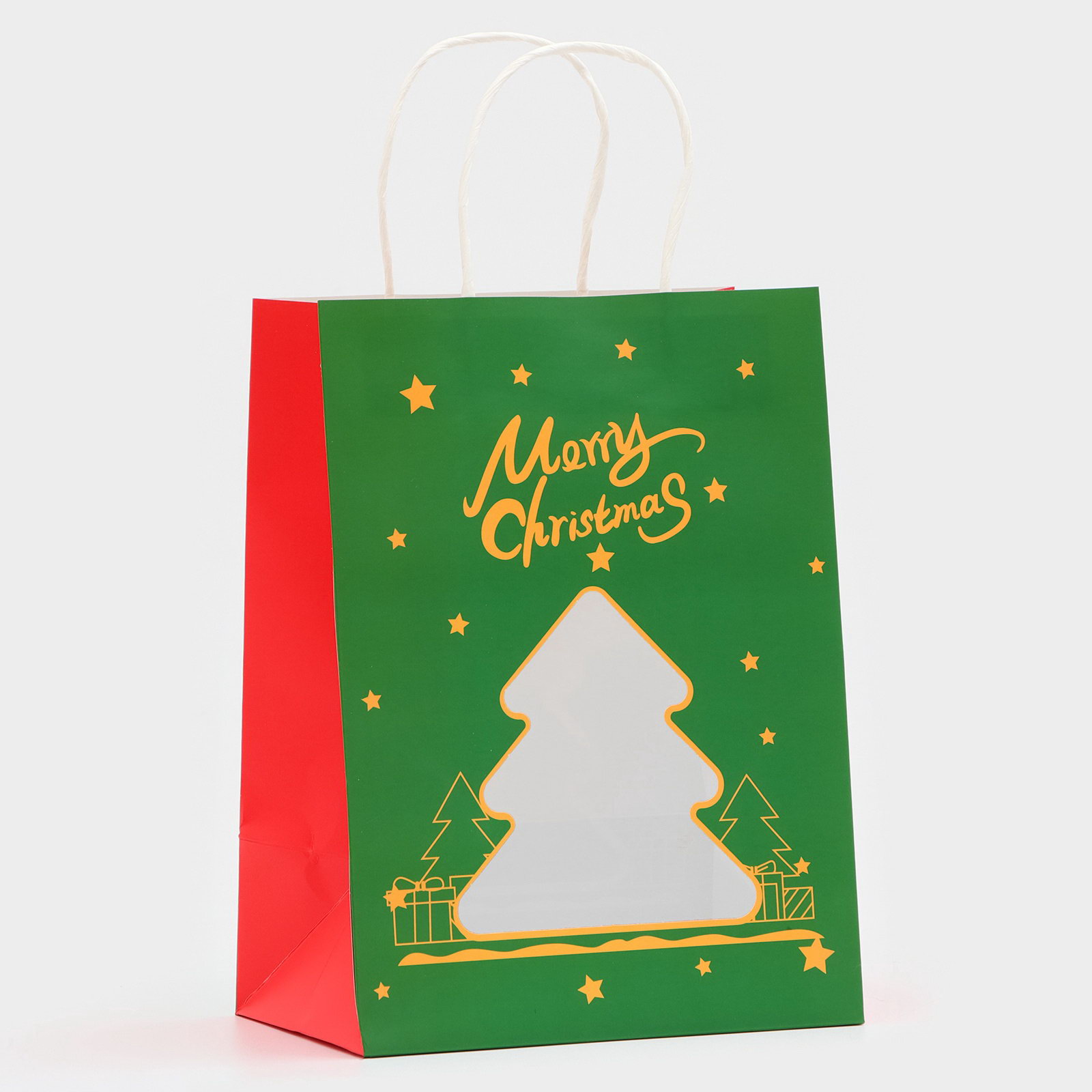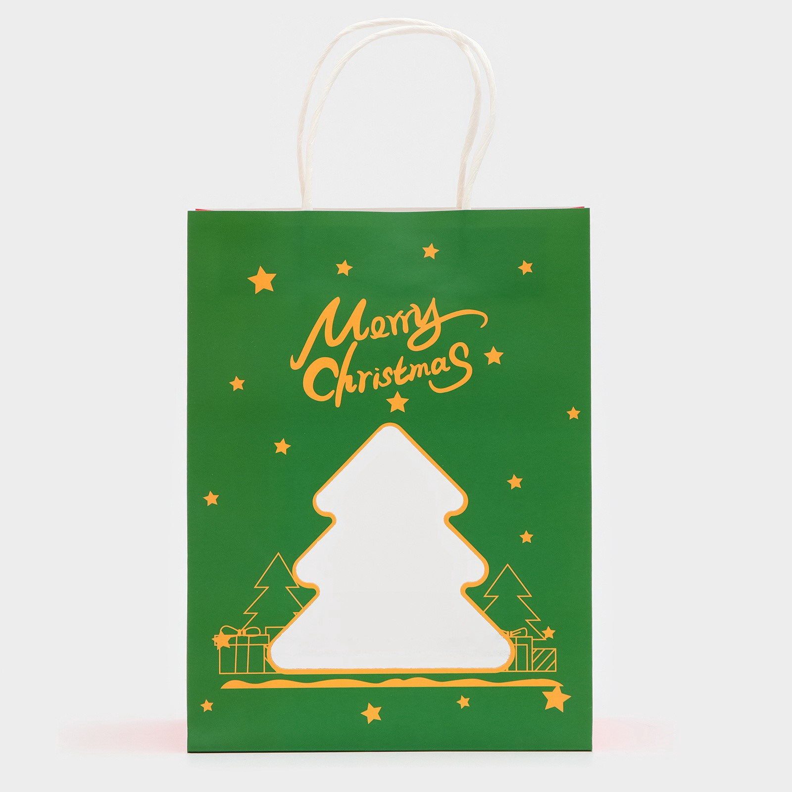 Пакет подарочный бумажный с окном "Ёлка" 19x26x13 см, крафт зеленый, UPAK LAND, Китай