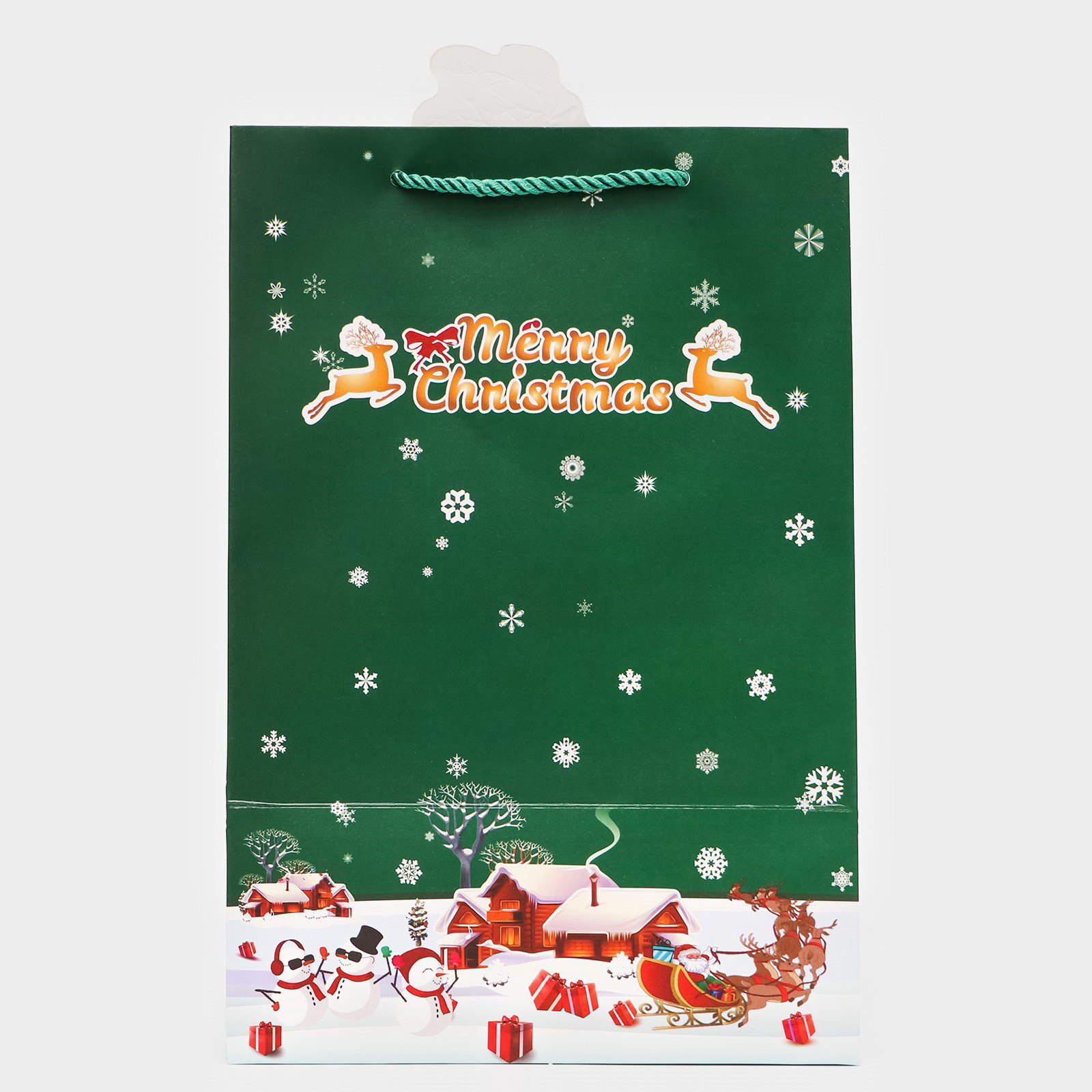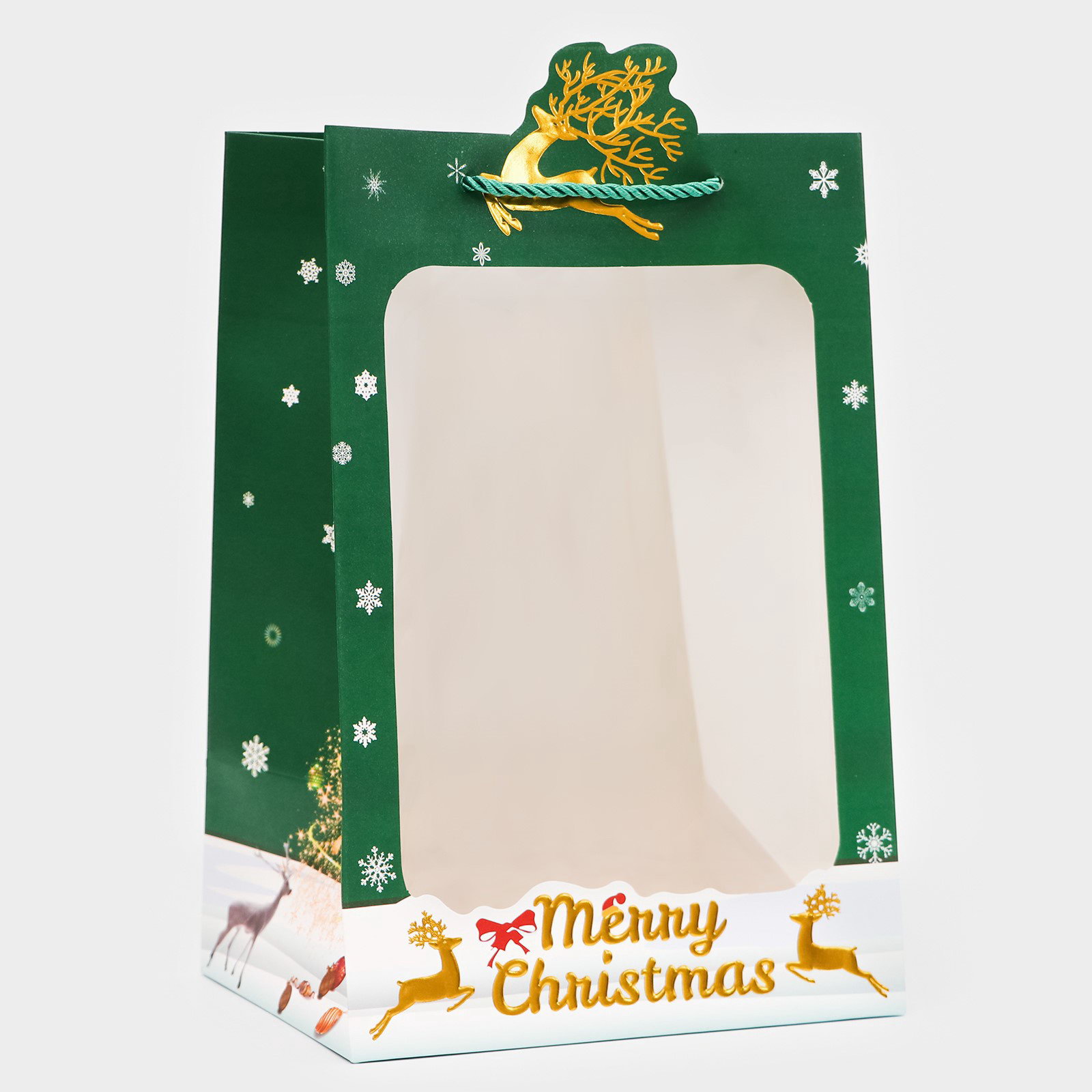 Пакет подарочный ламинированный с окном "Новый год" тиснение, 30x20x16 см, зеленый, UPAK LAND, Китай