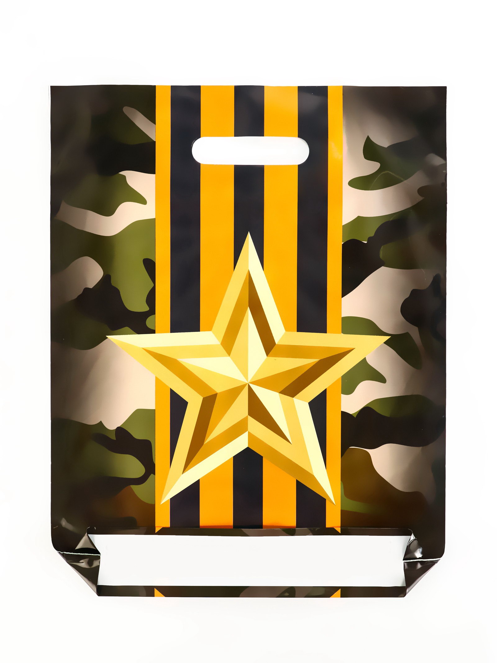 Для подарков защитникам: Пакет используют для презентов на День защитника Отечества и День Победы его внешний вид соответствует военной тематике. После использования упаковку можно применять для хранения армейских аксессуаров или туристического снаряжения. Сочетание камуфляжа и оранжевых элементов делает его практичным выбором для подарков настоящим мужчинам. | ||
