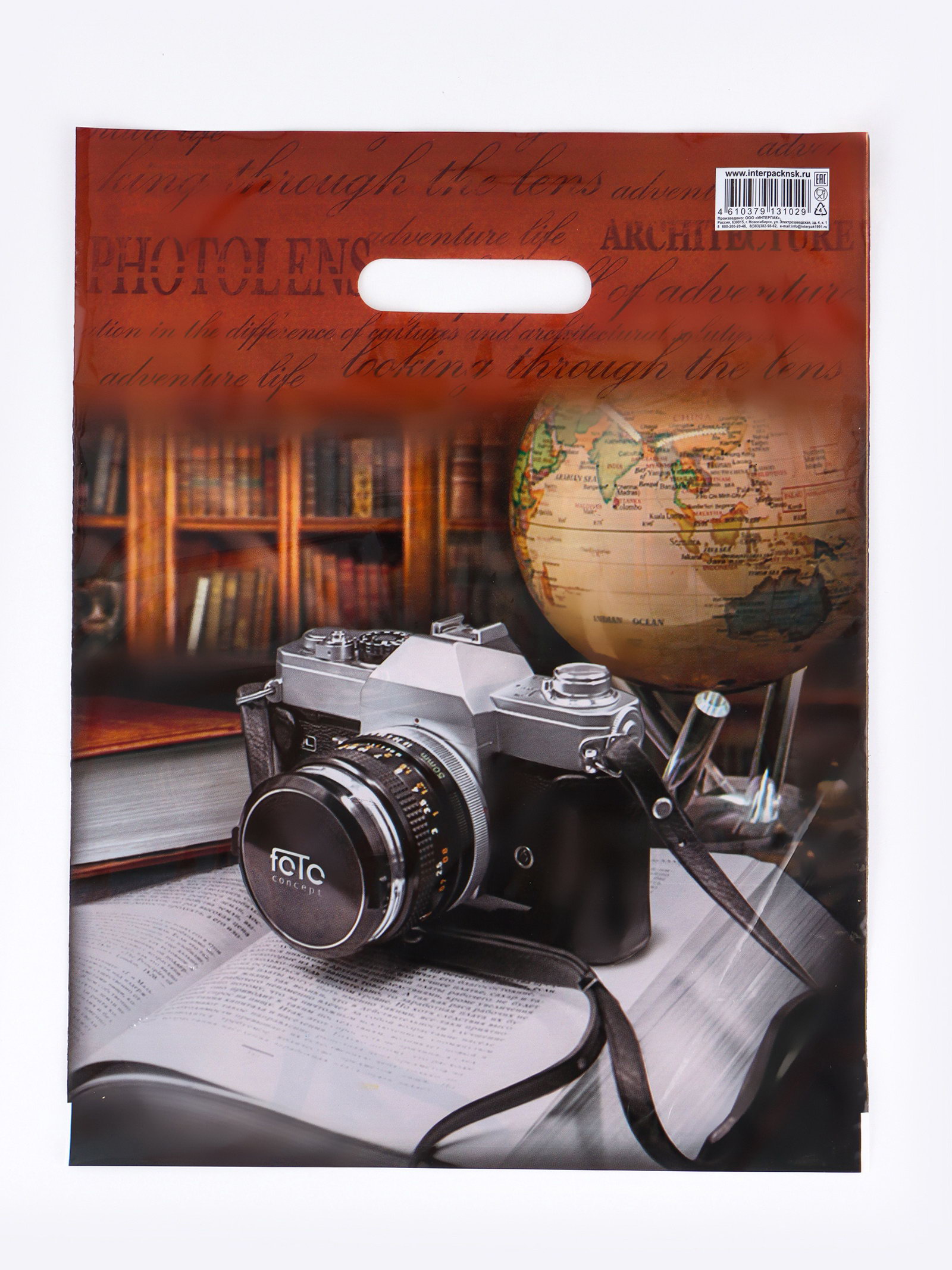 Пакет подарочный "Объектив" полиэтиленовый с вырубной ручкой, ламинированный 31x40 см, 30 мкм, Интерпак, Россия