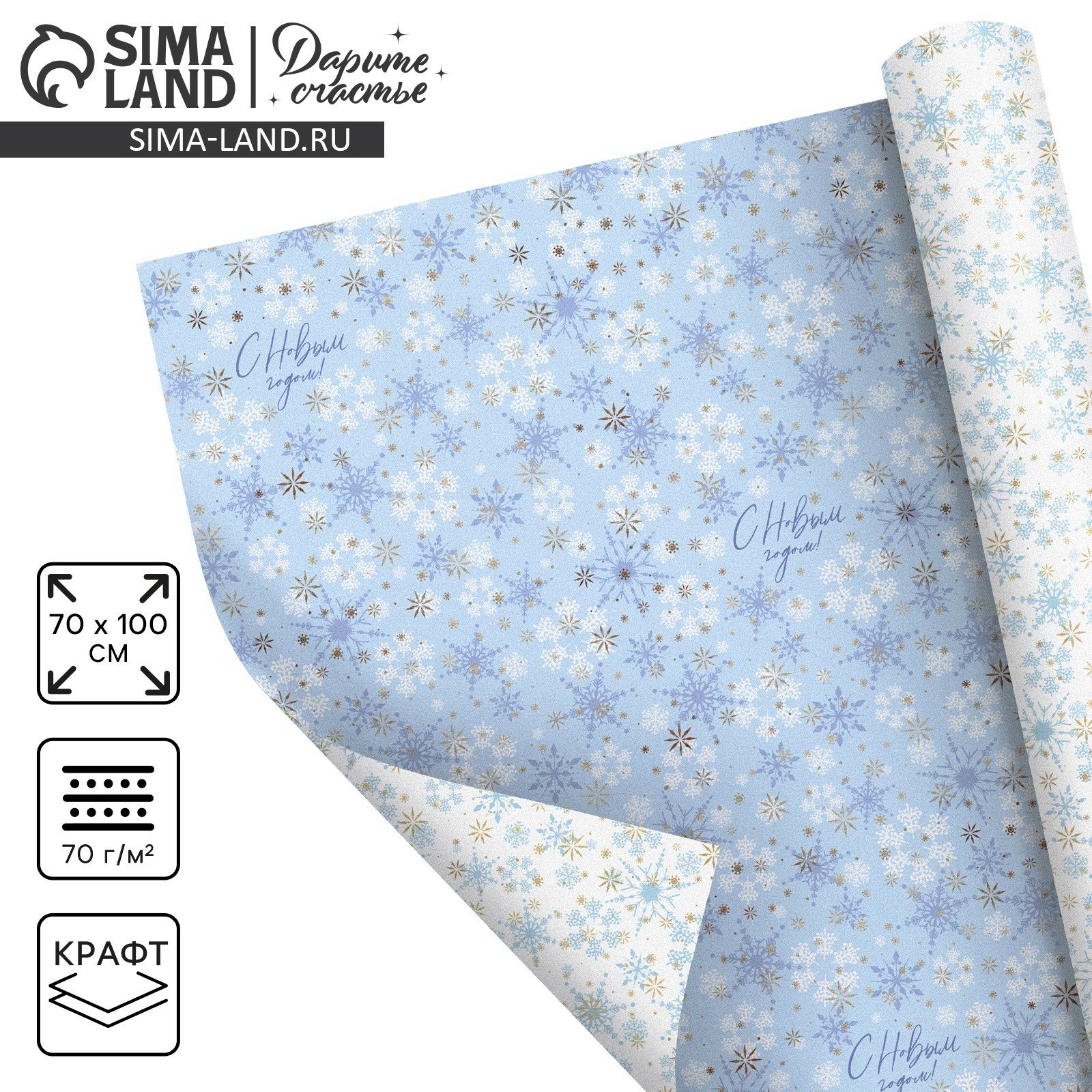 Упаковочная бумага двухсторонняя крафтовая "С Новым годом!", 70x100 см, Дарите Счастье, Россия