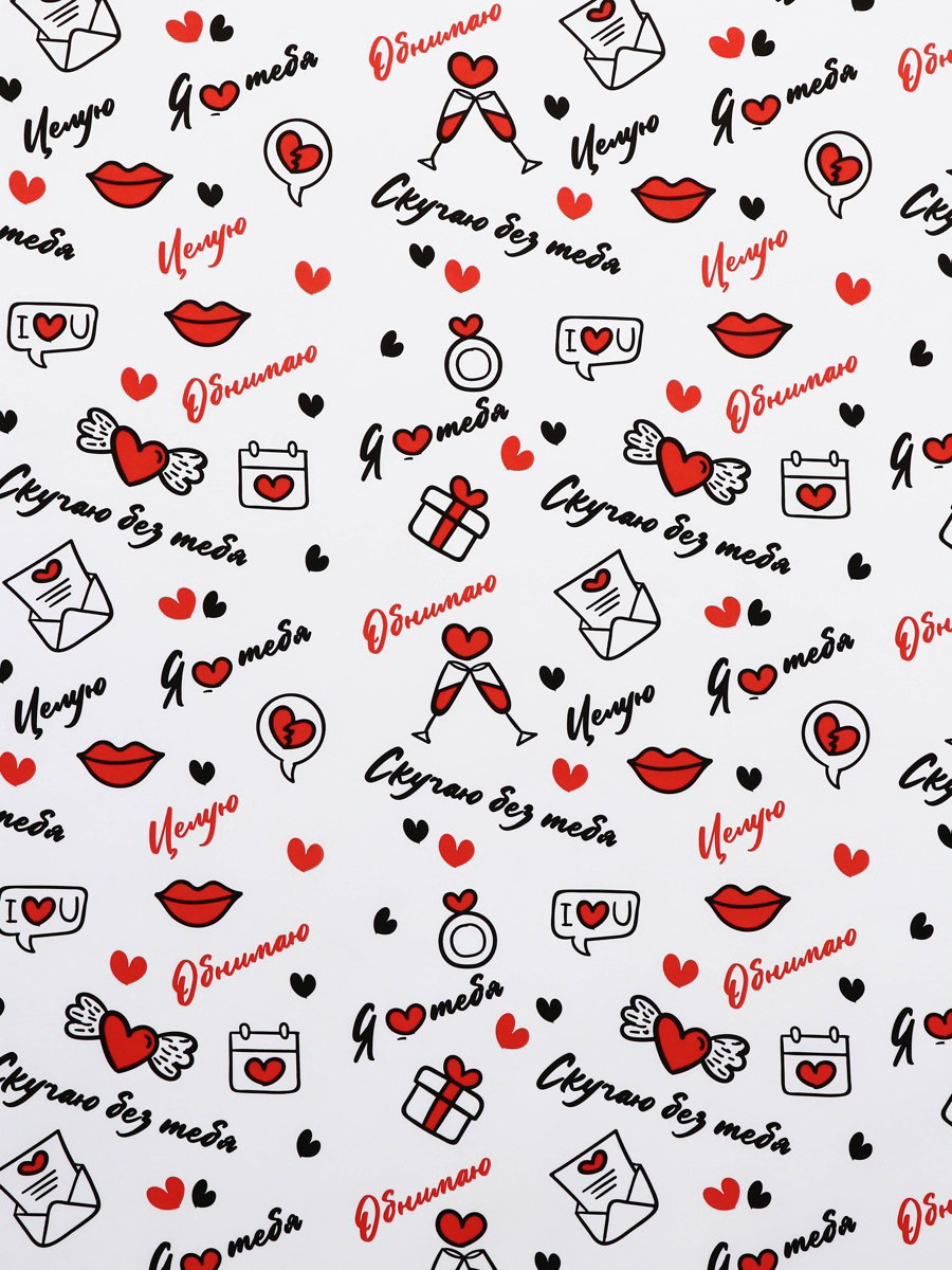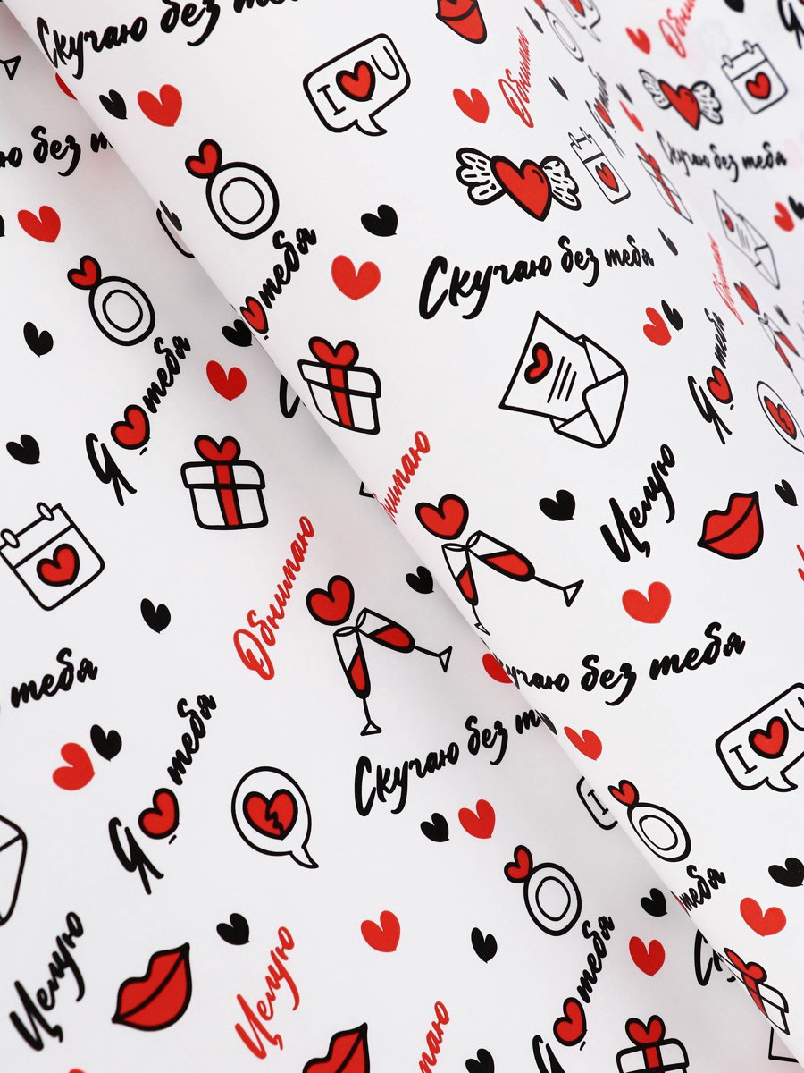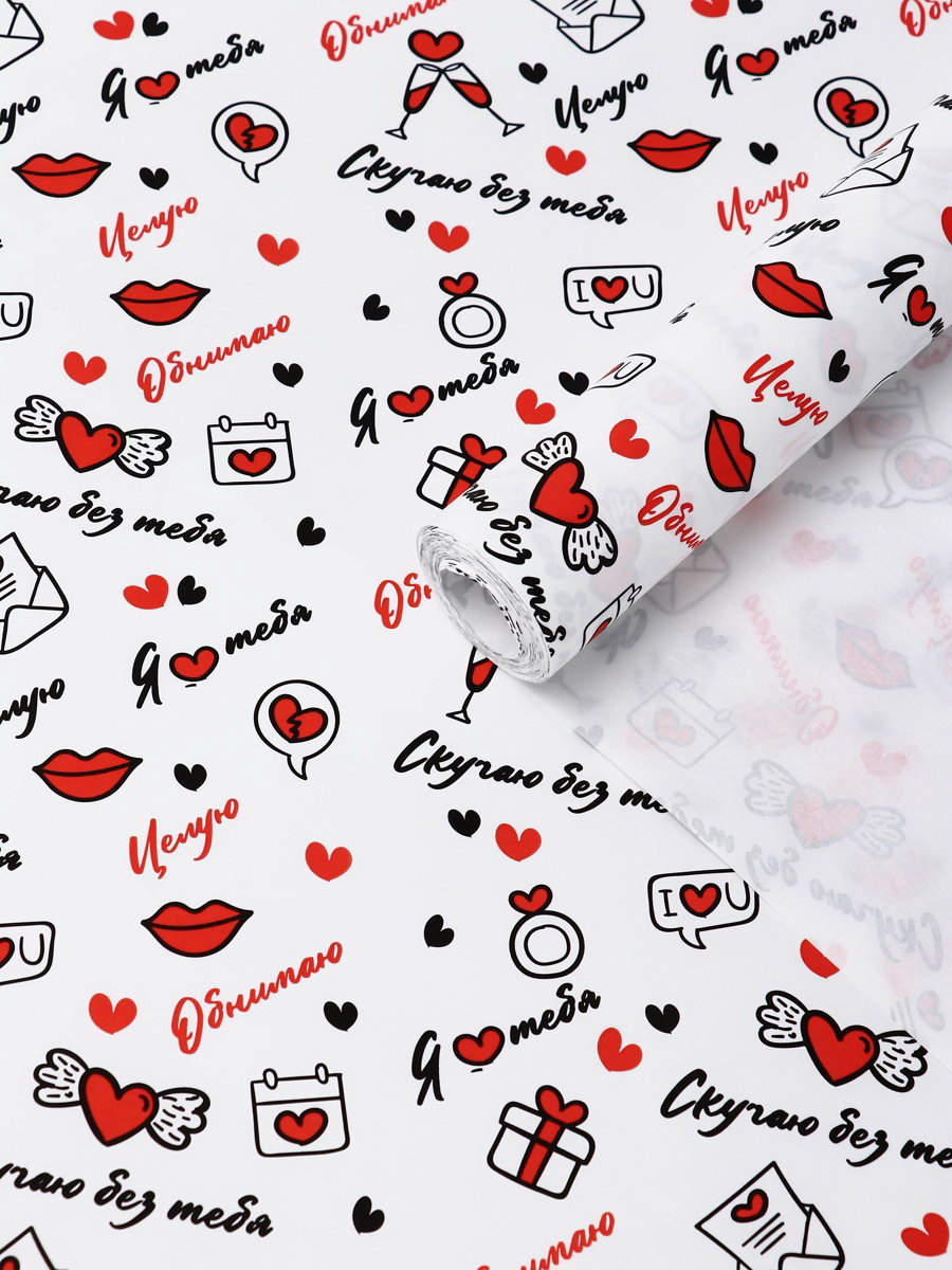 Бумага упаковочная крафт "Я люблю тебя" черный/красный на белом фоне, 0.68x10+-5% м, 60 г, UPAK LAND, Россия