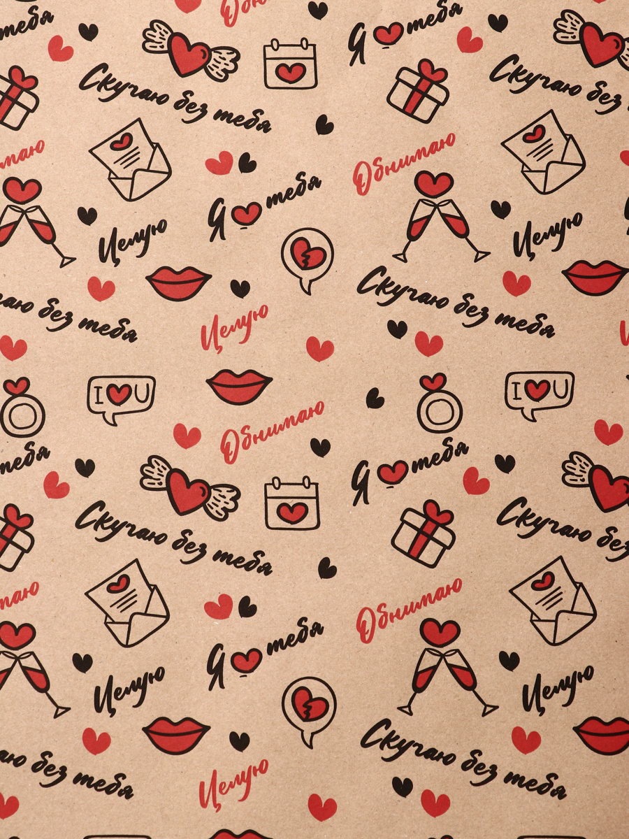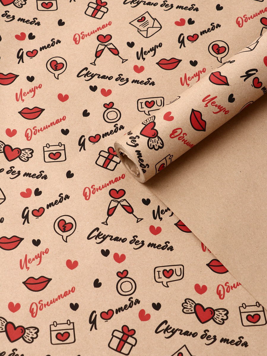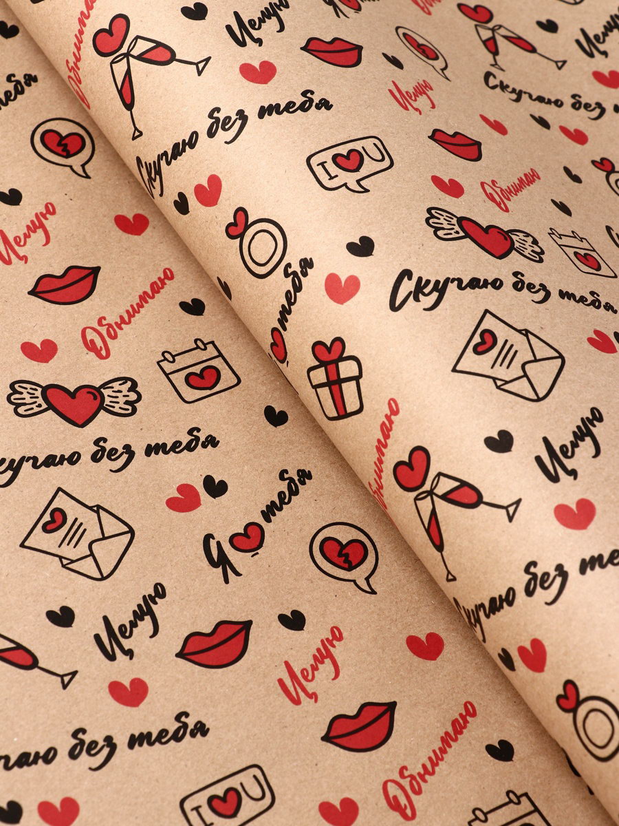 Бумага упаковочная крафт "Я люблю тебя" черный/красный на коричневом фоне, 0.68x10+-5% м, 60 г, UPAK LAND, Россия