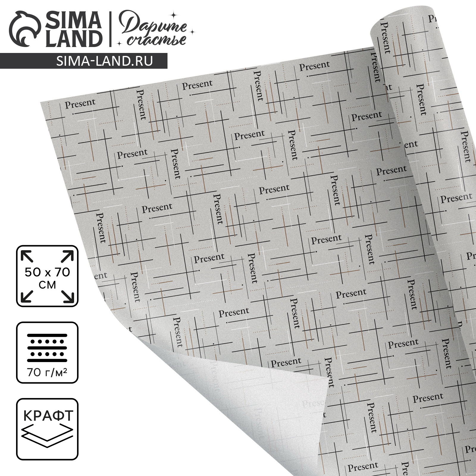 Бумага упаковочная крафтовая Present, 50 x 70 см, Дарите Счастье, Россия