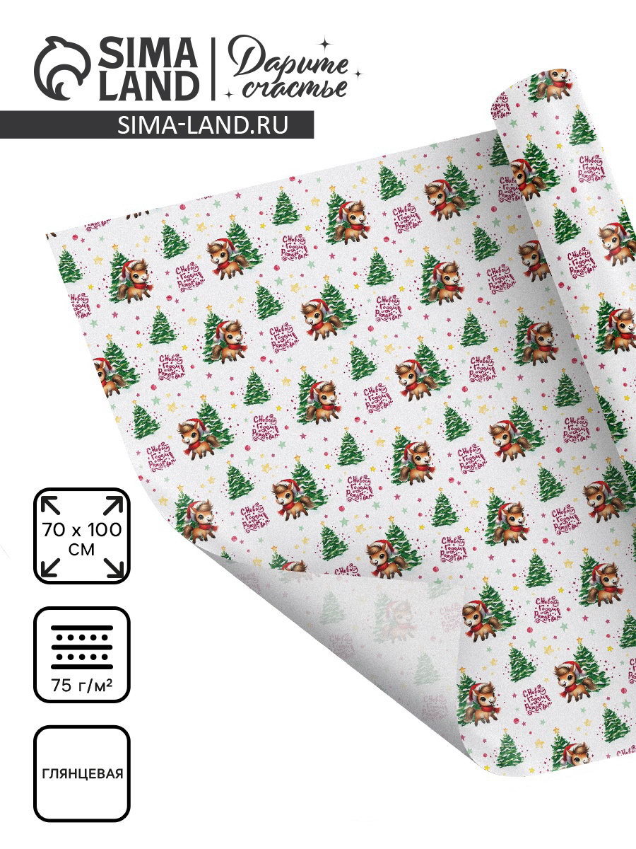 Бумага упаковочная глянцевая "Новый год 2026", лошадь, 70x100 см, Дарите Счастье, Россия