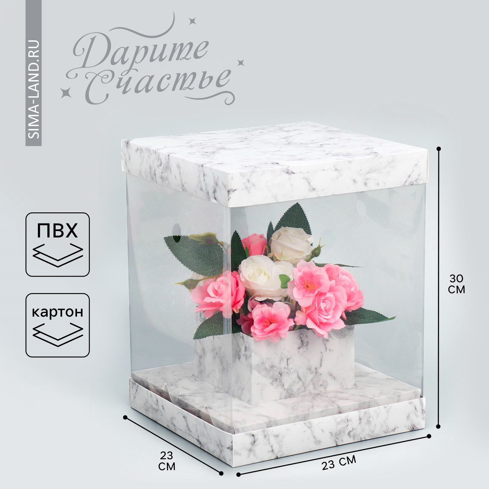 Коробка подарочная для цветов с вазой и пластиковыми окнами складная, упаковка, "Мрамор", 23x30x23 см, 23x23x30 см., Дарите Счастье, Китай