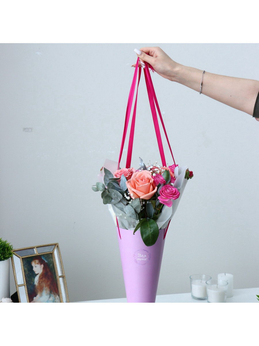 Пакет для цветов конусный круглый складной на лентах "Для тебя", 15x23.3x7.5 см, 0.3x48x24 см., Дарите Счастье, Россия