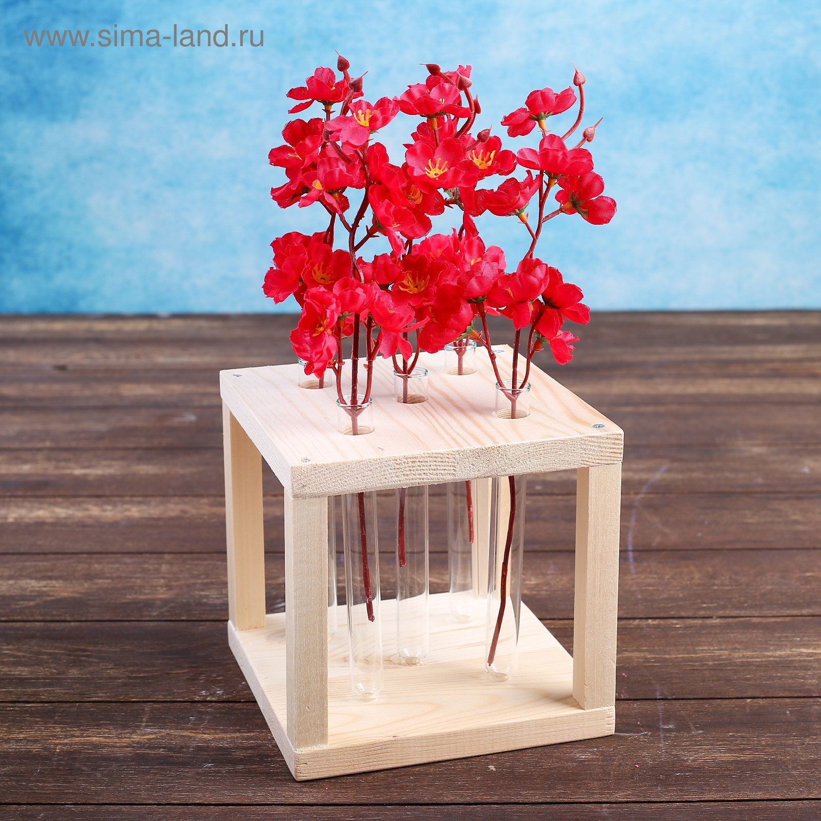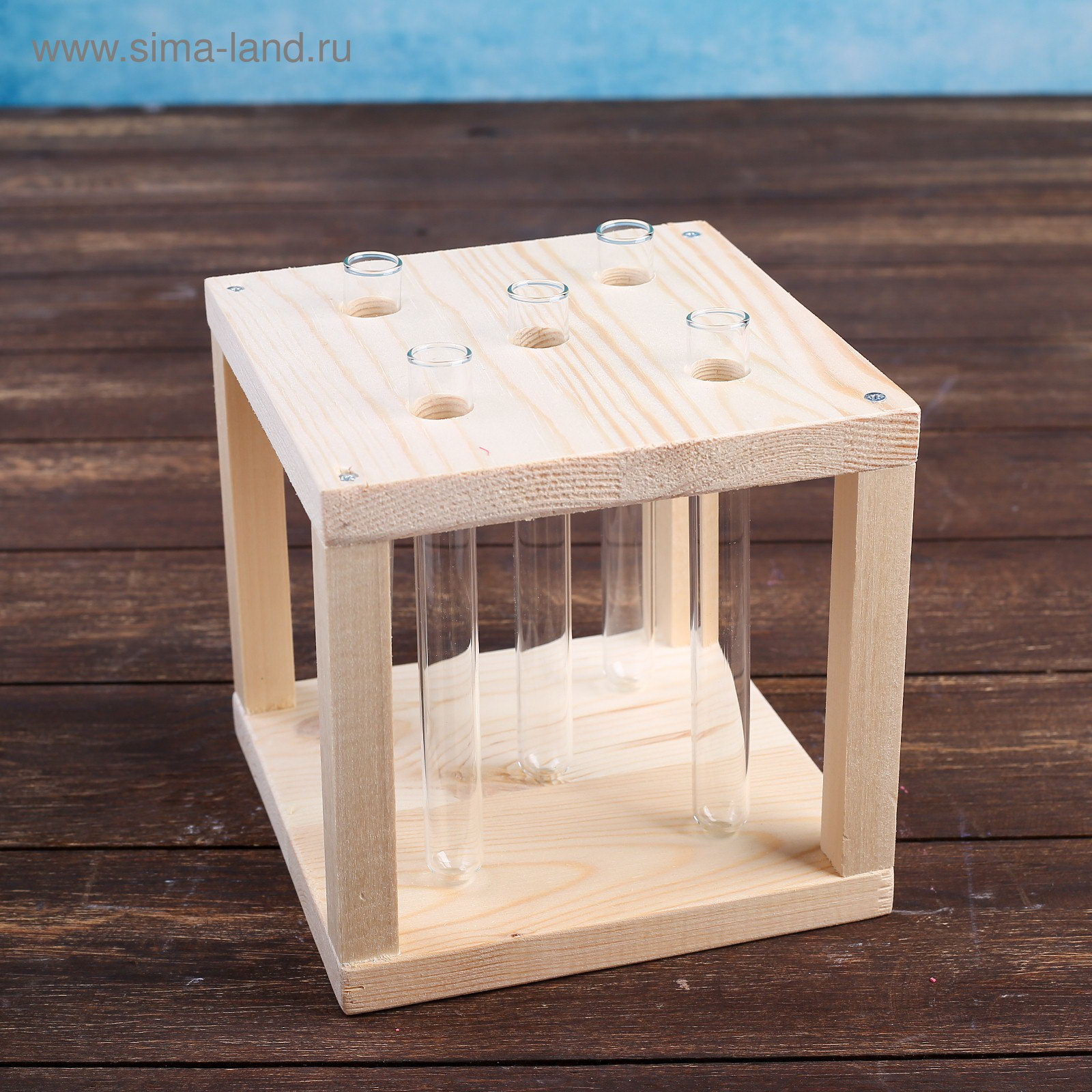 Кашпо деревянное 15.5x15.5x16.5 см с 5 колбами "Квадрат", натуральный, Дарим Красиво, Россия