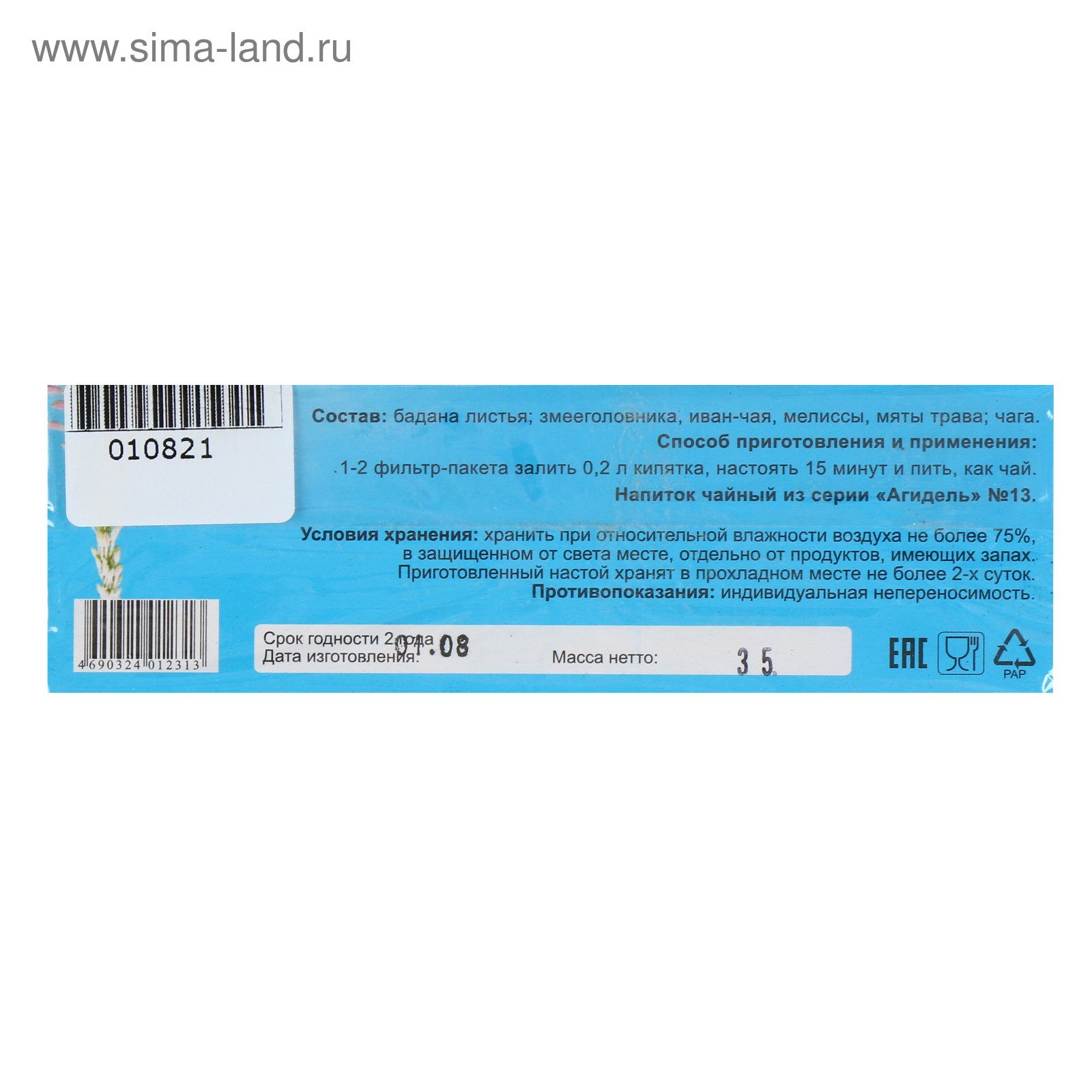 Размер упаковки: 7 x 4.5 x 13.5 см. Размер упаковки: 7 x 4.5 x 13.5 см. tnved: 2106909800 Вид: Чай Вид чая: Ассорти Вес нетто, г: 35 Форма выпуска: Чайный напиток Показания: Укрепление иммунитета Действие: Общеукрепляющее Температурное ограничение: Нет Назначение: Для иммунной системы Фасовка: Пакетированный Рекомендован для всей семьи при интенсивных умственных нагрузках, повышенной утомляемости, плохом аппетите; как общеукрепляющее, иммуномодулирующее, улучшающее обмен веществ, увеличивающее работоспособность, тонизирующее и одновременно успокаивающее средство. Состав: бадана листья, змееголовника, иван-чая, мелиссы, мяты трава, чага. Способ приготовления и применения: 1 – 2 фильтр-пакета залить 0,2 л кипятка, настоять 15 мин и пить, как чай. | ||