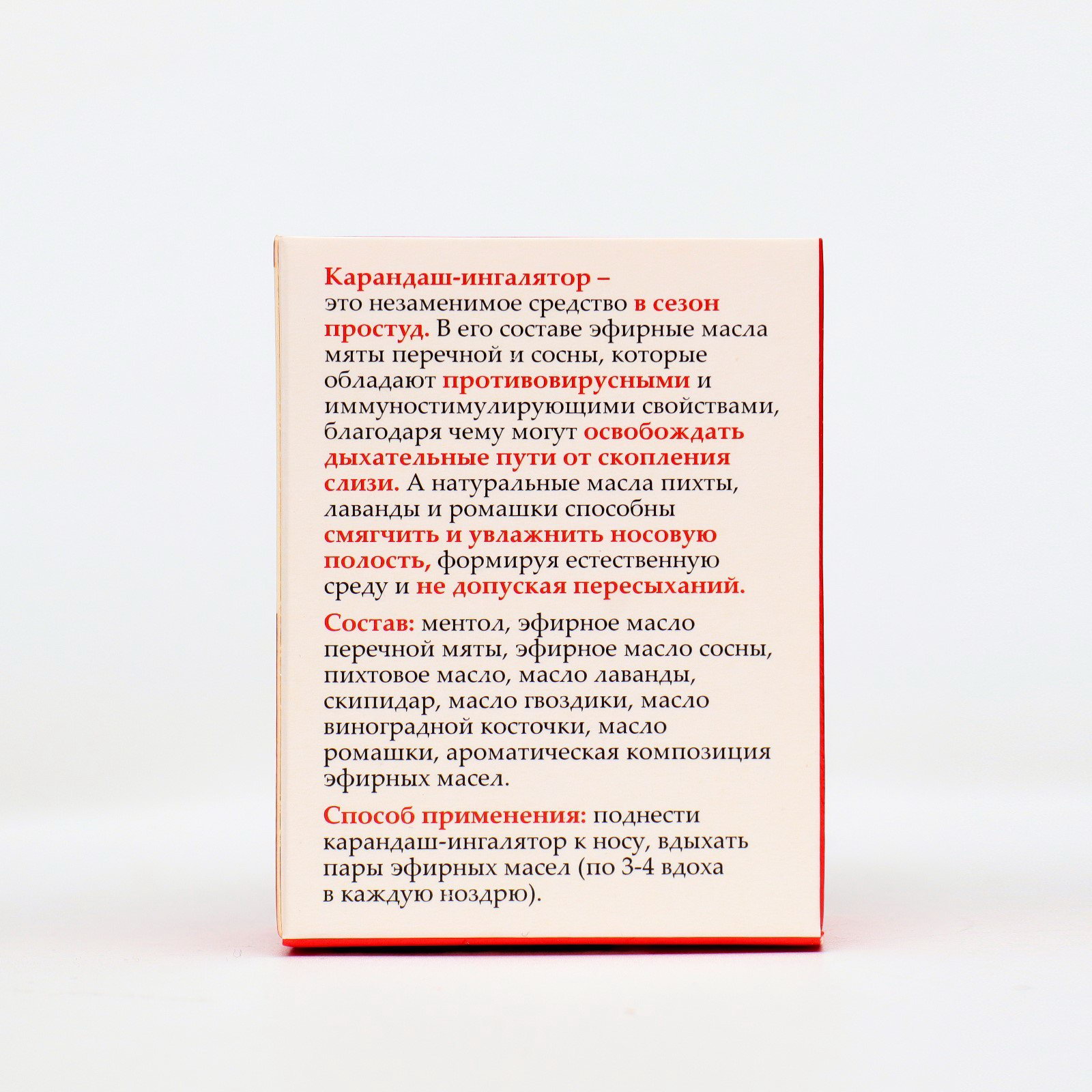 Размер упаковки: 3 x 6.5 x 5 см. tnved: 3304990000 Температурное ограничение: Нет Вес, г/Объём, мл: 1.3 Вид: Карандаш Карандаш-ингалятор на основе прополиса станет растительным помощником при насморке и заложенности носа. Масла сосны и лимона способны бережно смягчить слизистые, уменьшить воспаление, предупреждая образование мелких ранок. Прополис и масло ромашки обладают антисептическими свойствами, благодаря чему могут нормализовать работу слизистых и освободить верхние дыхательные пути. Состав: ментол, эфирное масло перечной мяты, прополис, масло сосны, масло лимона, пихтовое масло, масло виноградной косточки, масло ромашки, ароматическая композиция эфирных масел. Способ применения: поднести карандаш-ингалятор к носу, вдыхать пары эфирных масел (по 3-4 вдоха в каждую ноздрю). | ||