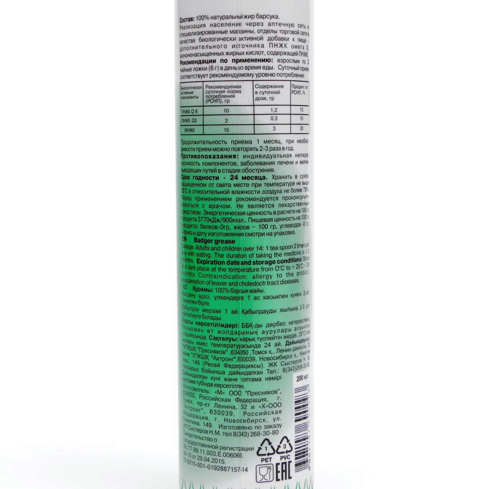 Жир обладает гиполипидемическим свойством - нормализует жировой обмен в организме, профилактика атеросклероза, онкологических заболеваний. В барсучьем жире содержится олеиновая кислота, которая положительно влияет на сердечно-сосудистую систему. Он полезен людям, страдающим ожирением, сердечно-сосудистыми заболеваниями. При полиартрите, ревматизме, суставных болях барсучий жир используется в качестве растирания. Состав: 100% барсучий жир. Способ применения: по 1 чайной ложке 2 раза в день во время еды. Запивать тёплой водой, чаем, молоком. Продолжительность приема до 1 месяца. | ||