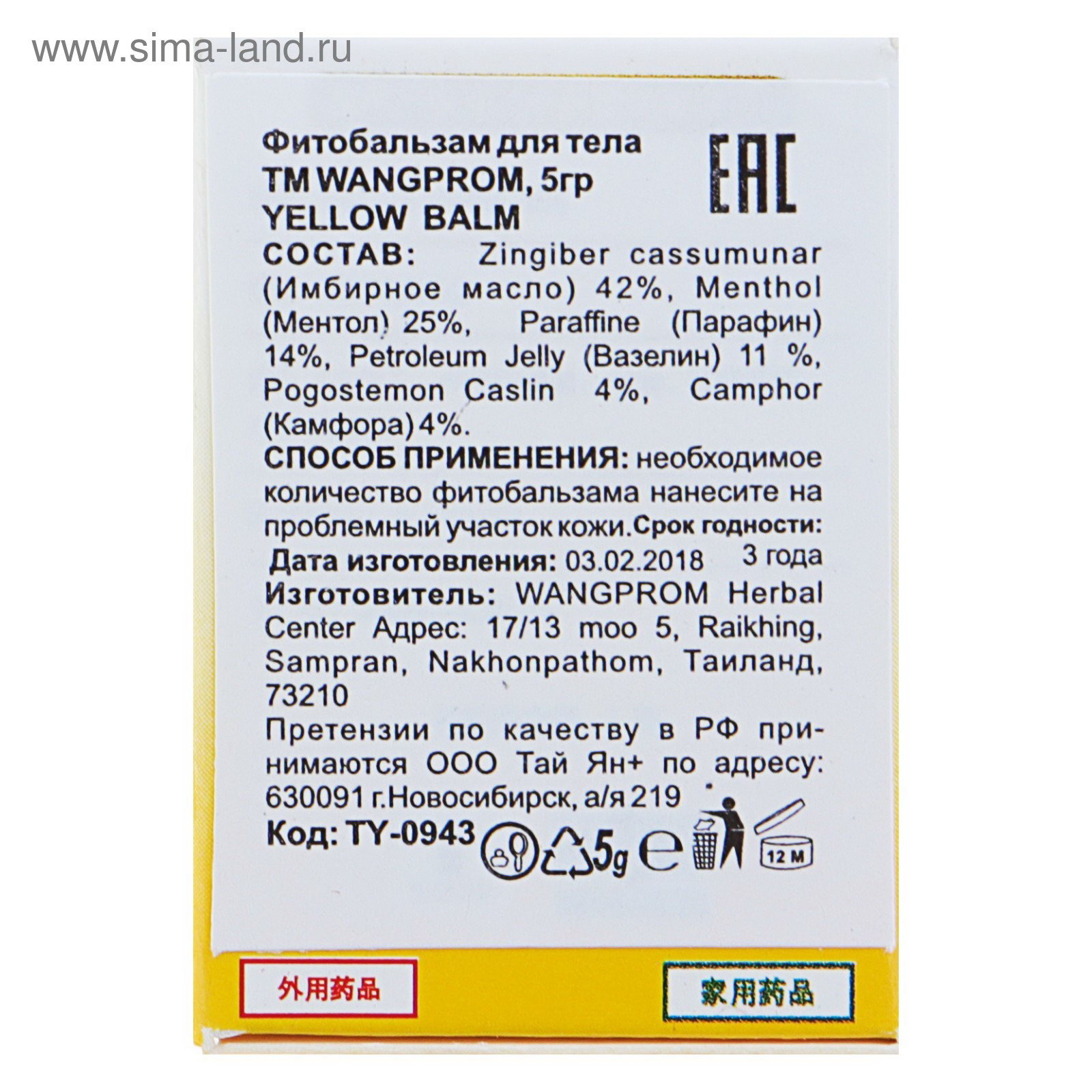 Размер упаковки: 3 x 4 x 3 см. tnved: 3304990000 Температурное ограничение: Нет Вид: Бальзам Вес, г/Объём, мл: 5 Вес, г/Объём, мл: 5 Назначение: От боли в суставах и мышцах Желтый охлаждающий фитобальзам снимет боль в Ваших мышцах! Легендарные 100%-натуральные бальзамы на травах и эфирных маслах от семьи Вангпром изготовлены по древним рецептам тайских фармацевтов. Это самые популярные фитобальзамы Таиланда, которые широко используются внутри страны и далеко за ее пределами. Причина в невероятной эффективности и быстроте действия! Действие: