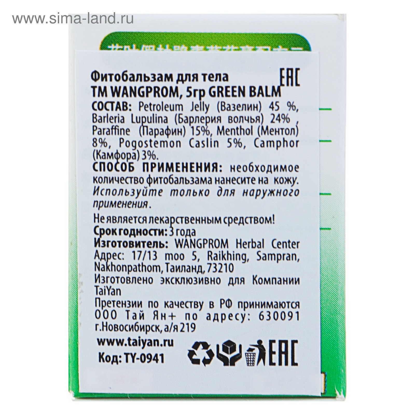 Размер упаковки: 3 x 4 x 3 см. Размер упаковки: 3 x 4 x 3 см. tnved: 3304990000 Температурное ограничение: Нет Вид: Бальзам Вес, г/Объём, мл: 5 Назначение: От боли в суставах и мышцах Зеленый охлаждающий фитобальзам снимет воспаления и поможет при защемлении нервов. Легендарные 100%-натуральные бальзамы на травах и эфирных маслах от семьи Вангпром изготовлены по древним рецептам тайских фармацевтов. Это самые популярные фитобальзамы Таиланда, которые широко используются внутри страны и далеко за ее пределами. Причина в невероятной эффективности и быстроте действия! Действие: