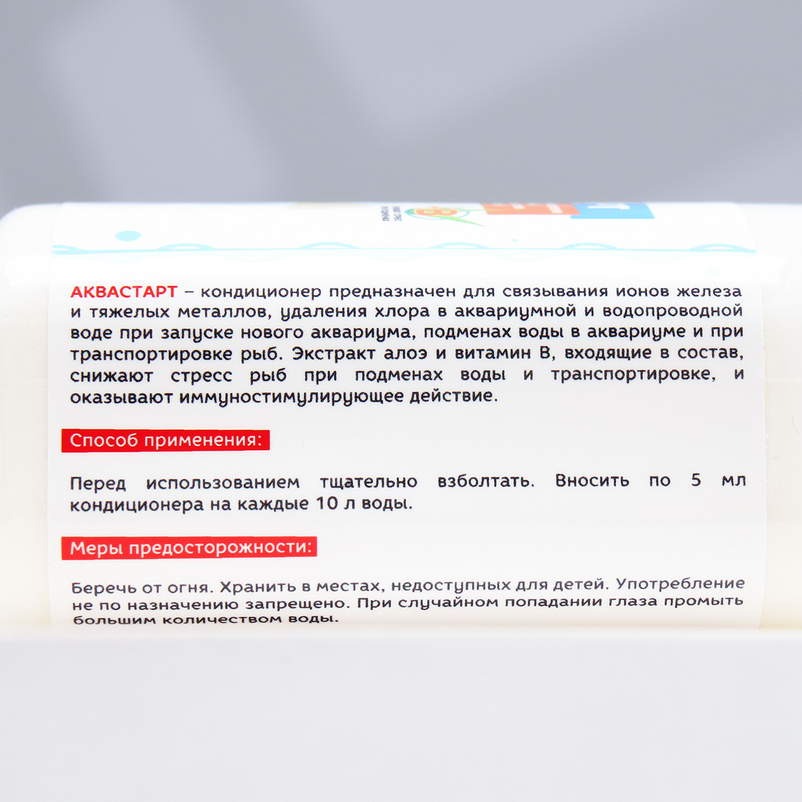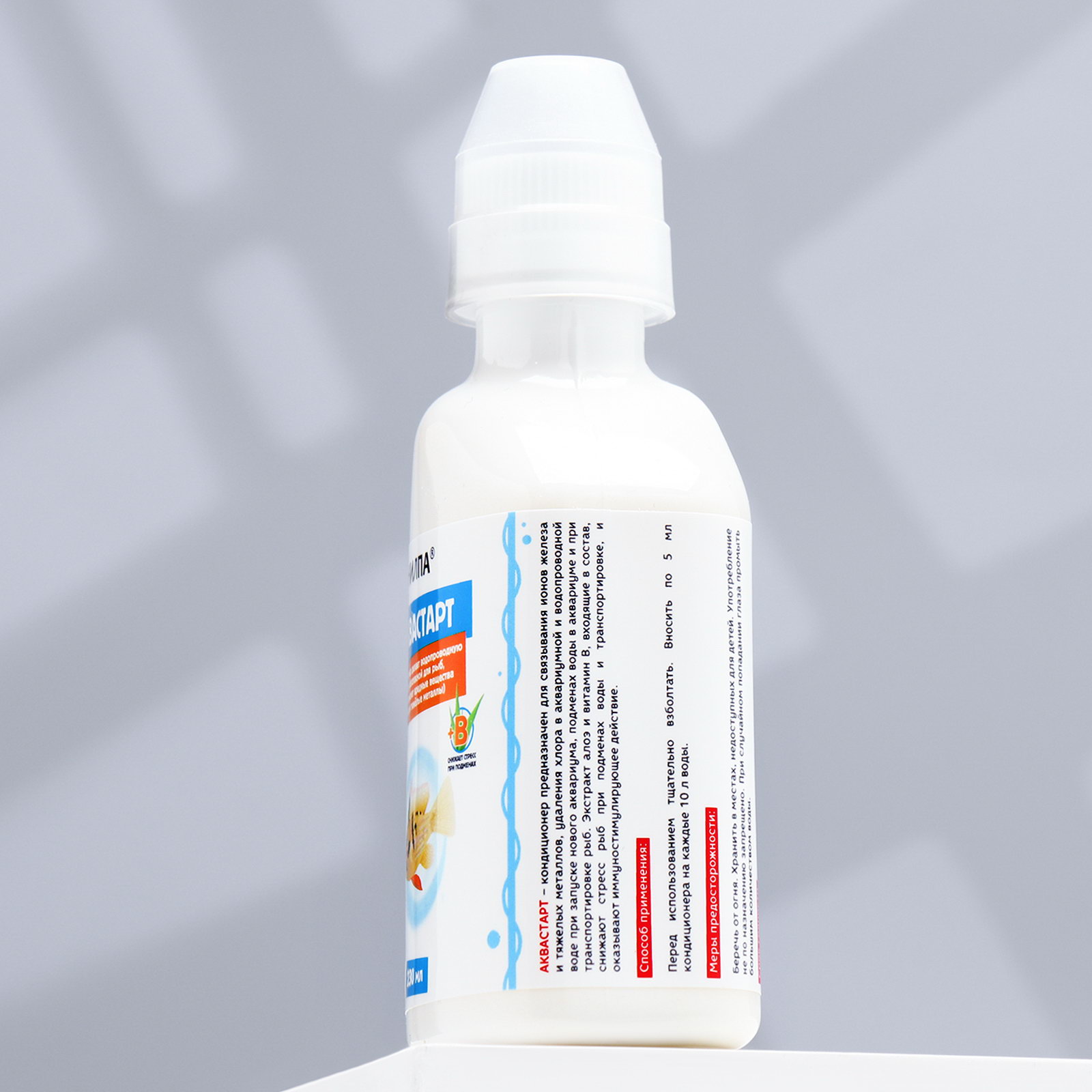 Размер упаковки: 6 x 15 x 4.5 см. tnved: 2825908500 Темпер. ограничение НЕ ВЫШЕ ℃: +30 Темпер. ограничение НЕ НИЖЕ ℃: +1 Температурное ограничение: Нет Вид: Кондиционеры Аквастарт– кондиционер предназначен для связывания ионов железа и тяжелых металлов, удаления хлора в аквариумной и водопроводной воде при запуске нового аквариума, подменах воды в аквариуме и при транспортировке рыб. Экстракт алоэ и витамин B, входящие в состав, снижают стресс рыб при подменах воды и транспортировке, и оказывают иммуностимулирующее действие. Способ применения: Перед использованием тщательно взболтать. Вносить по 5 мл кондиционера на каждые 10 л воды. Меры предосторожности: Беречь от огня. Хранить в местах, недоступных для детей. Употребление не по назначению запрещено. При случайном попадании глаза промыть большим количеством воды. | ||
