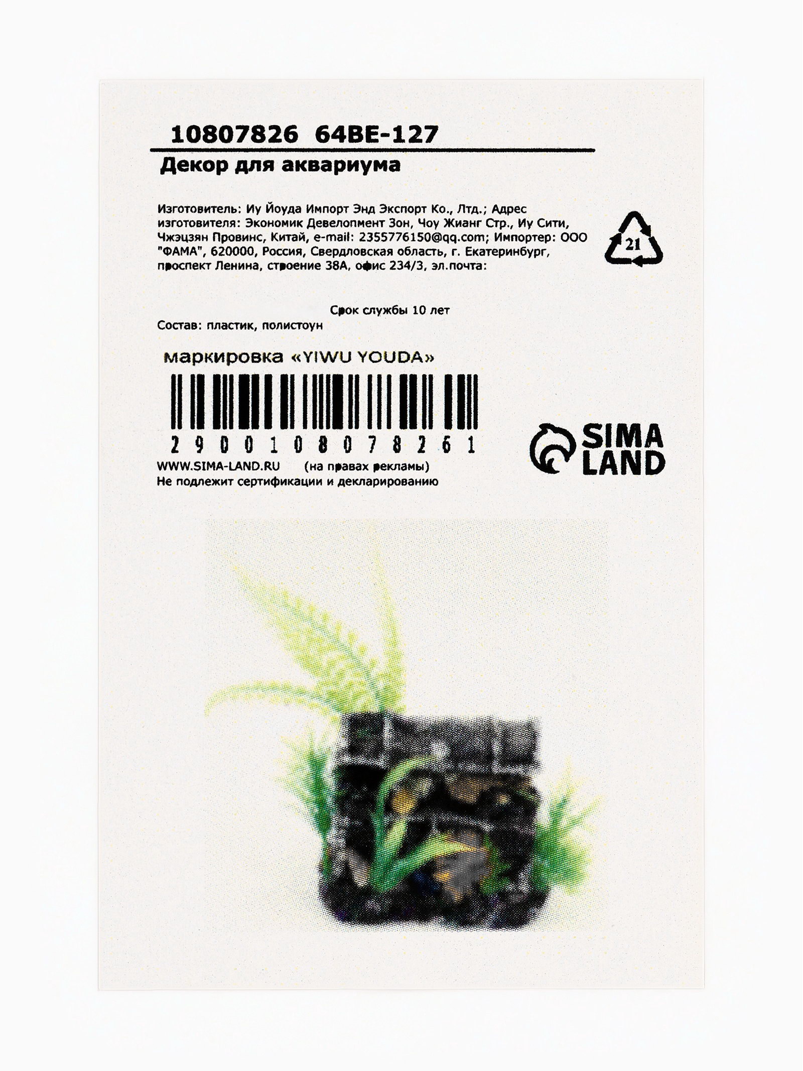 Размер упаковки: 9 x 11 x 13 см. tnved: 3926400000 Форма фигуры: Сундук Цвет: Коричневый Там, где начинается подводное приключение. Аквариумный декор в форме сундука это не просто украшение, а центральный элемент подводного сюжета. Коричневый оттенок и фактура камня делают его похожим на затонувшее сокровище, застывшее на дне среди водорослей и песка.