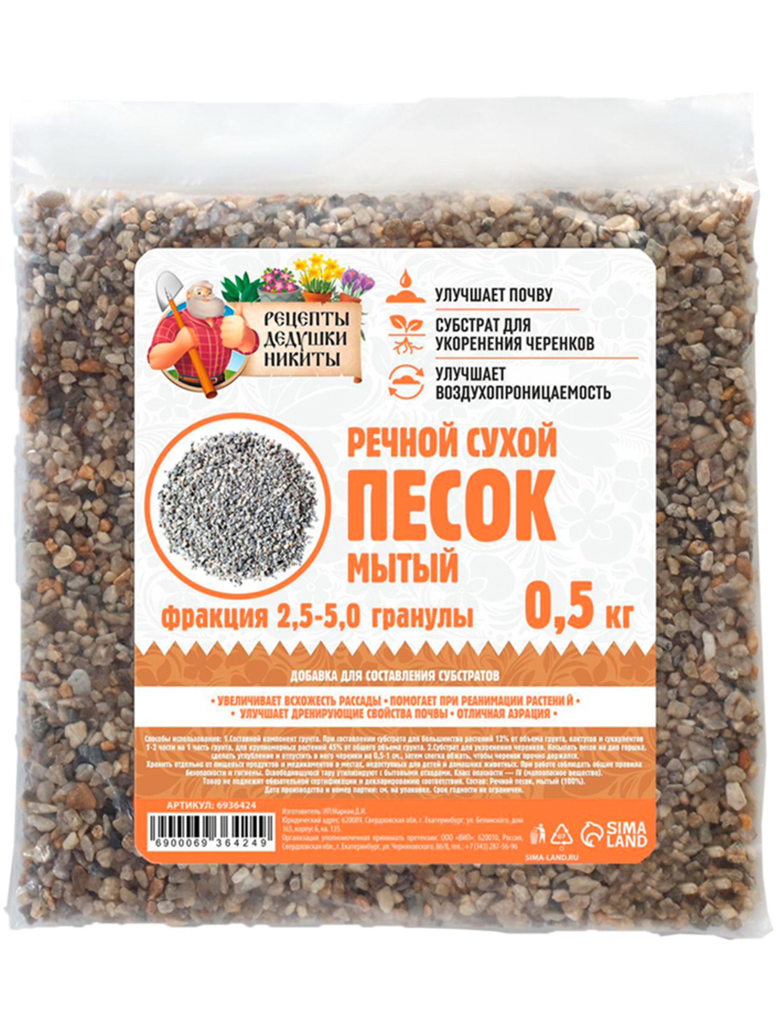 Речной песок сухой, фр 2.5-5.0, гранулы, 0.5 кг, Рецепты дедушки Никиты, Россия