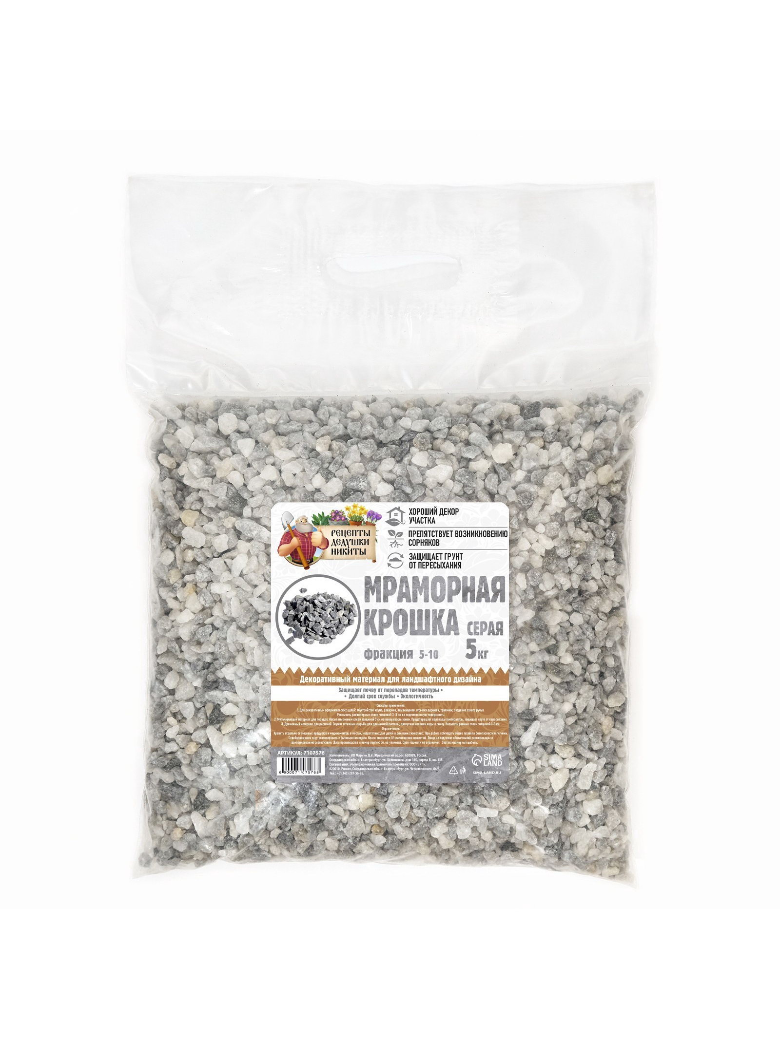 Мраморная крошка "Рецепты Дедушки Никиты", серая, фр 5-10 мм, 5 кг, Рецепты дедушки Никиты, Россия