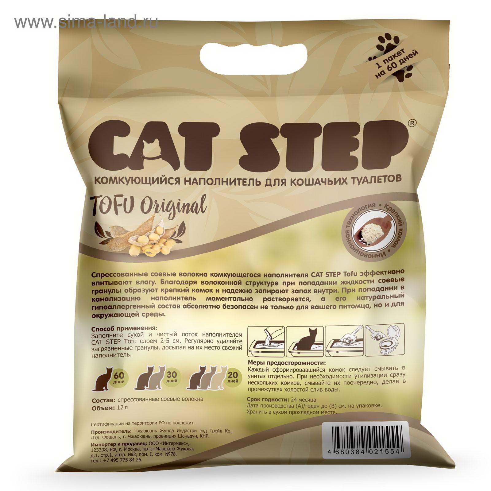 Наполнитель для кошачьих туалетов Tofu Original 12L, растительный комкующийся, 11x40x55.5 см., Cat Step, Китай