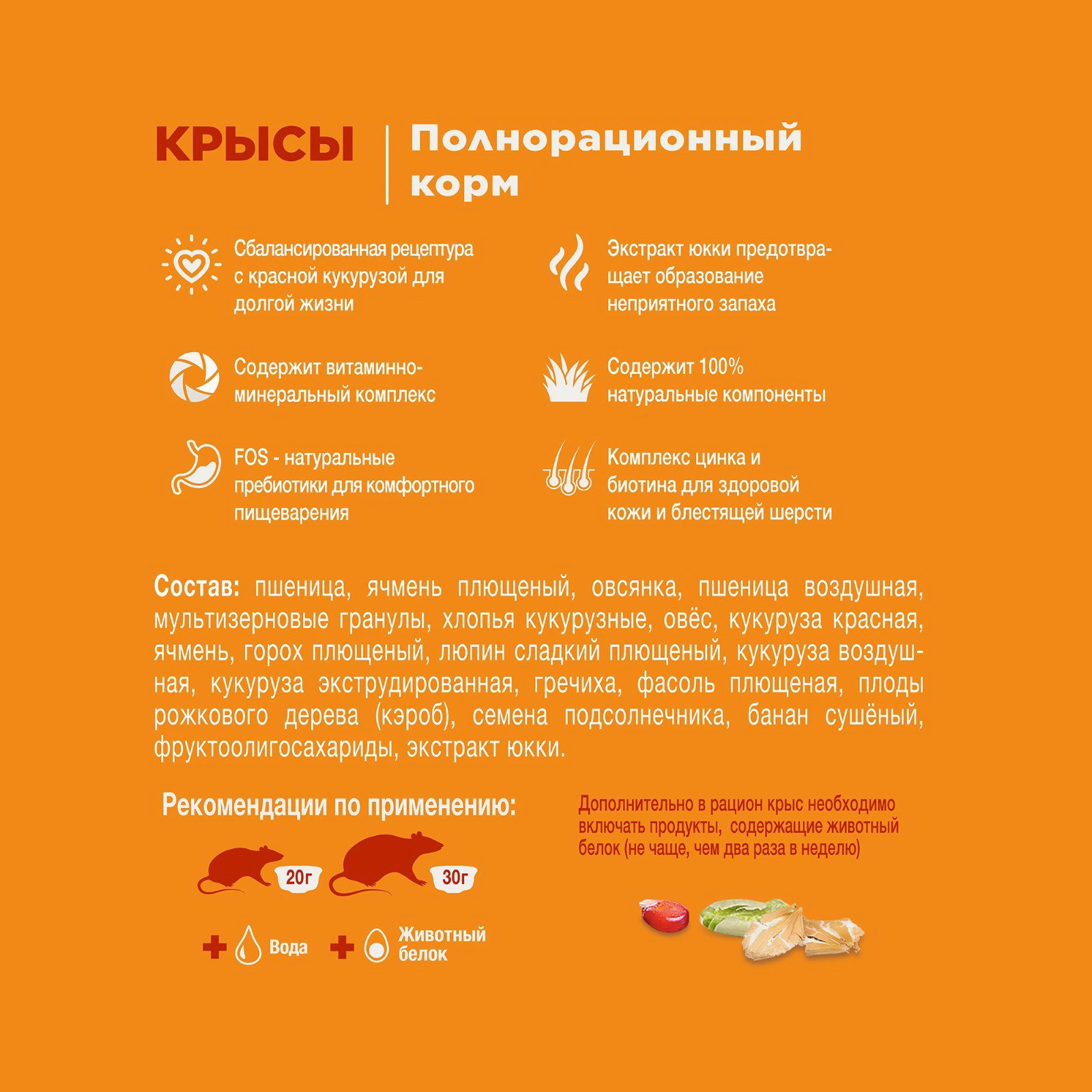Размер упаковки: 11.5 x 20 x 6.5 см. Особенности корма: Основной Назначение: Для крыс и мышей Возраст: Для всех возрастов Вид: Смесь Запрет реализации по сегментам: 00000000578 tnved: 2309109000 tnved: 2309109000 Меркурий: Да Честный знак: Да Вес, г: 400 Есть вет.справка: Да Зоотовары с отдельным счётом: Да Температурное ограничение: Нет Темпер. ограничение НЕ НИЖЕ ℃: +1 Темпер. ограничение НЕ ВЫШЕ ℃: +30 Корм Little One для крыс - полнорационный корм с добавлением витаминов и минеральных веществ. Имеет сбалансированный состав, включающий в себя разнообразные зерна, семена, редкие плоды, а также сушеный банан, обеспечивающий прекрасную поедаемость корма. Разработан с учетом специфических потребностей крыс и содержит красную кукурузу, благоприятно влияющую на их здоровье и долголетие. Рекомендации по применению: cуточная доза корма для крыс составляет 20–30 г в зависимости от размера зверька. Пищевая ценность: белки - 12,2%; жиры - 4,1%; клетчатка - 4,3%; зола - 7%; кальций - 0,9%; фосфор - 0,6%. Состав: Пшеница, ячмень плющеный, овсянка, пшеница воздушная, мультизерновые гранулы, хлопья кукурузные, овес, кукуруза красная, ячмень, горох плющеный, люпин сладкий плющеный, кукуруза воздушная, кукуруза экструдированная, гречиха, фасоль плющеная, плоды рожкового дерева (кэроб), семена подсолнечника, банан сушеный, фруктоолигосахариды, экстракт юкки. | ||