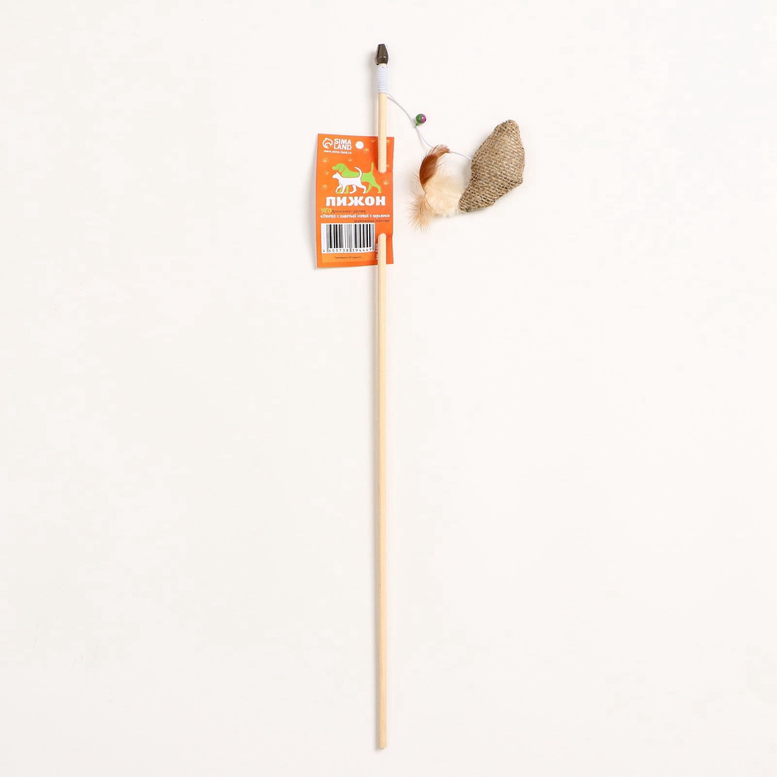 Дразнилка - удочка из эко-материалов "Птичка с кошачьей мятой и перьями", деревянная палочка, Пижон, Россия