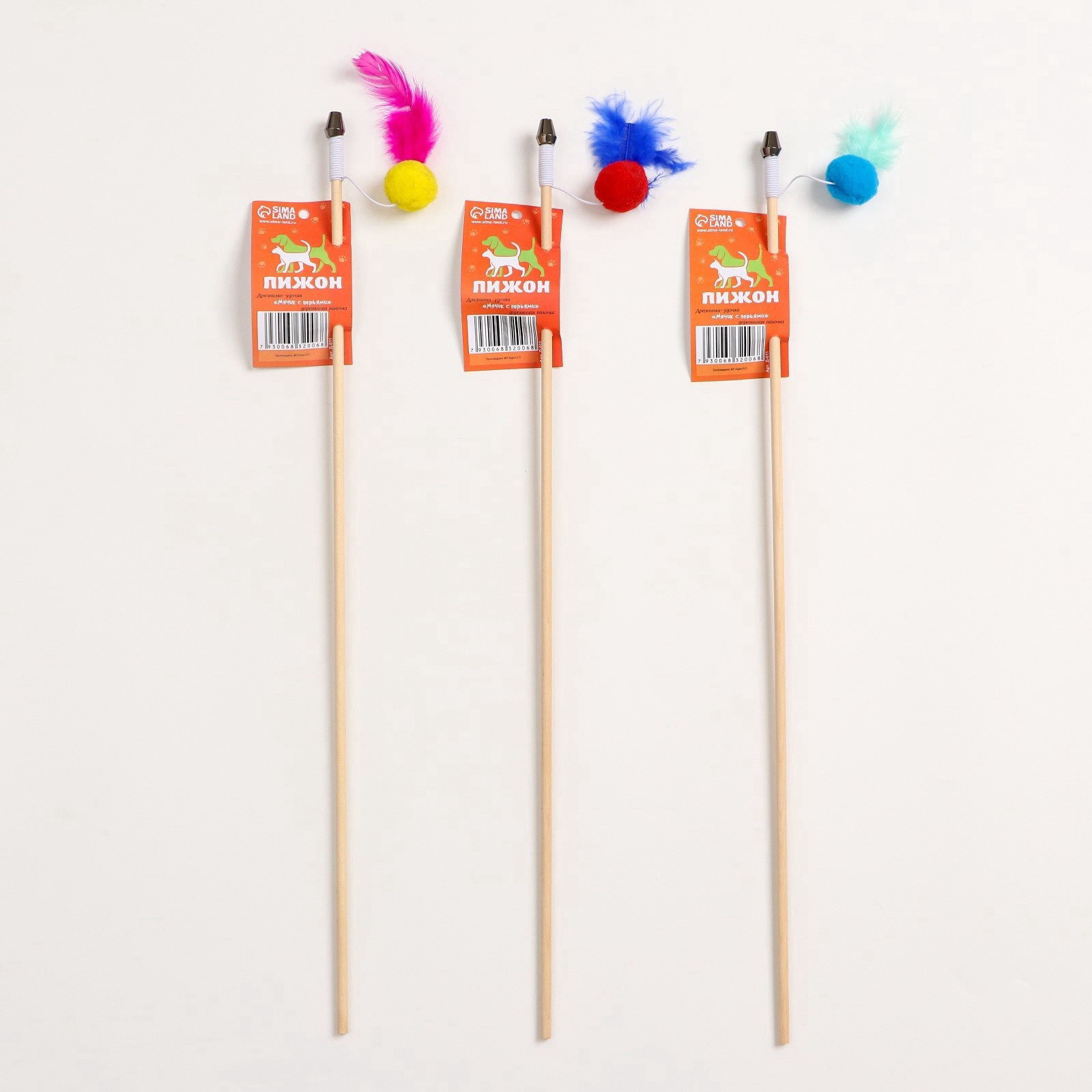 Дразнилка - удочка "Мячик с перьями", на деревянной палочке, цвет МИКС, Пижон, Россия