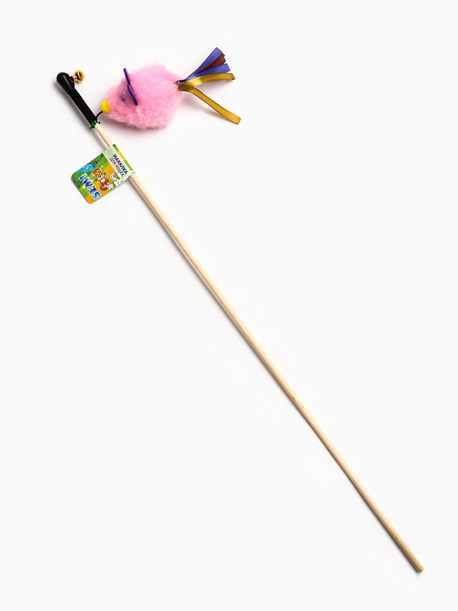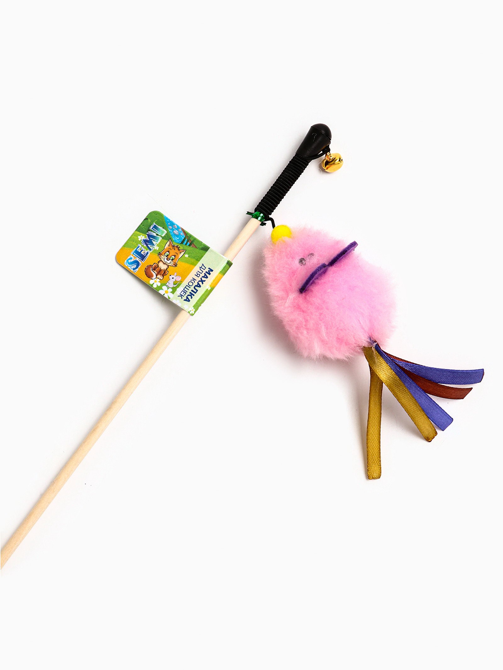 Дразнилка - удочка "Мышка". с колокольчиком, на деревянной палочке, розовая, Россия