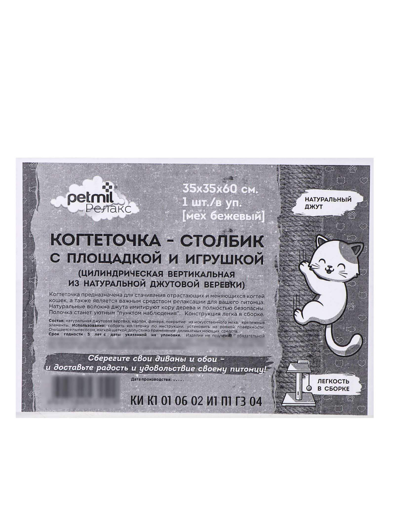 Вид: С игрушкой, С когтеточкой, С полкой Размер упаковки: 45 x 10 x 37 см. tnved: 4602900000 Температурное ограничение: Нет Материал обмотки столбика: Джут Форма: Квадратная Цвет: Серый Рисунок: Нет Высота, см: 60 Ширина, см: 35 Когтеточка-столбик "Релакс" многофункциональная конструкция высотой 60 см с джутовой обмоткой, полкой-лежанкой и подвесной игрушкой. Серый цвет и строгая геометрия вписываются в любой интерьер, а продуманная компоновка отвечает базовым потребностям кошки: точить когти, наблюдать за обстановкой, отдыхать и играть всё на одном объекте. Особенности: