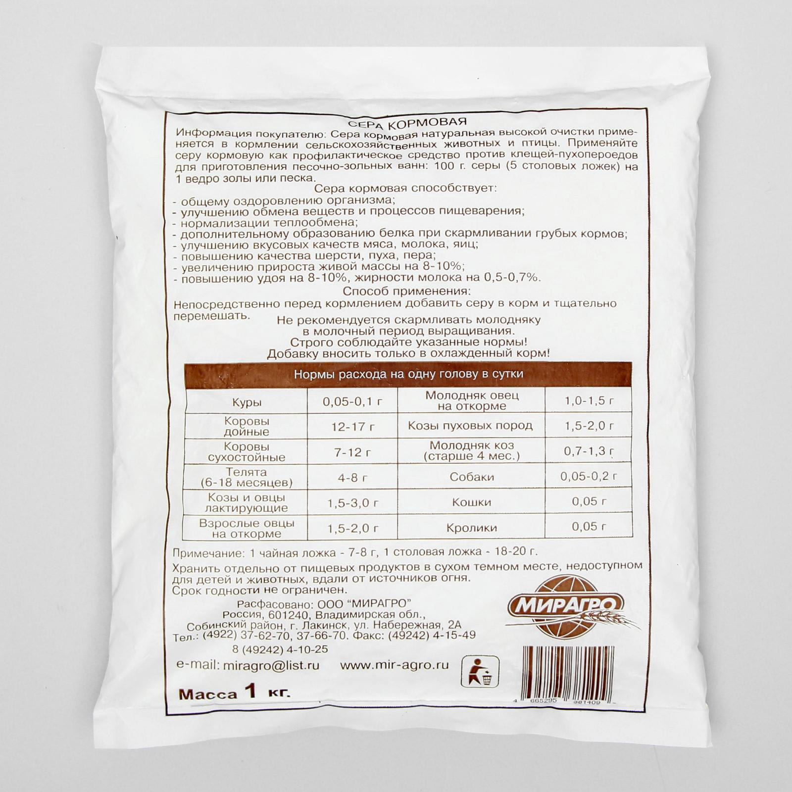 Способ применения: 100 г серы (5 столовых ложек) на 1 ведро золы или песка. Непосредственно перед кормлением добавить серу в корм и тщательно перемешать. Не рекомендуется скармливать молодняку в молочный период выращивания. Строго соблюдайте указанные нормы. Добавку вносить только в охлажденный корм! 1 чайная ложка 7-8г, 1 столовая ложка 18-2 гр Рекомендуемые нормы ввода в грамм в сутки: куры 0,05 – 0,1 г, молодняк овец на откорме 1,0 – 1,5 г, коровы дойные 12 – 17 г, козы пуховых пород 1,5 – 2,0 г, коровы сухостойные 7 – 12 г, молодняк коз (старше 4 мес.) 0,7 – 1,3 г, кролики 0,05 гр Условия хранения: в сухом, защищённом от прямых солнечных лучей, прохладном месте, недоступном для детей и животных. Хранить серу кормовую отдельно от пищевых продуктов, вдали от источников огня. Срок годности неограничен. Состав: сера 100%. | ||