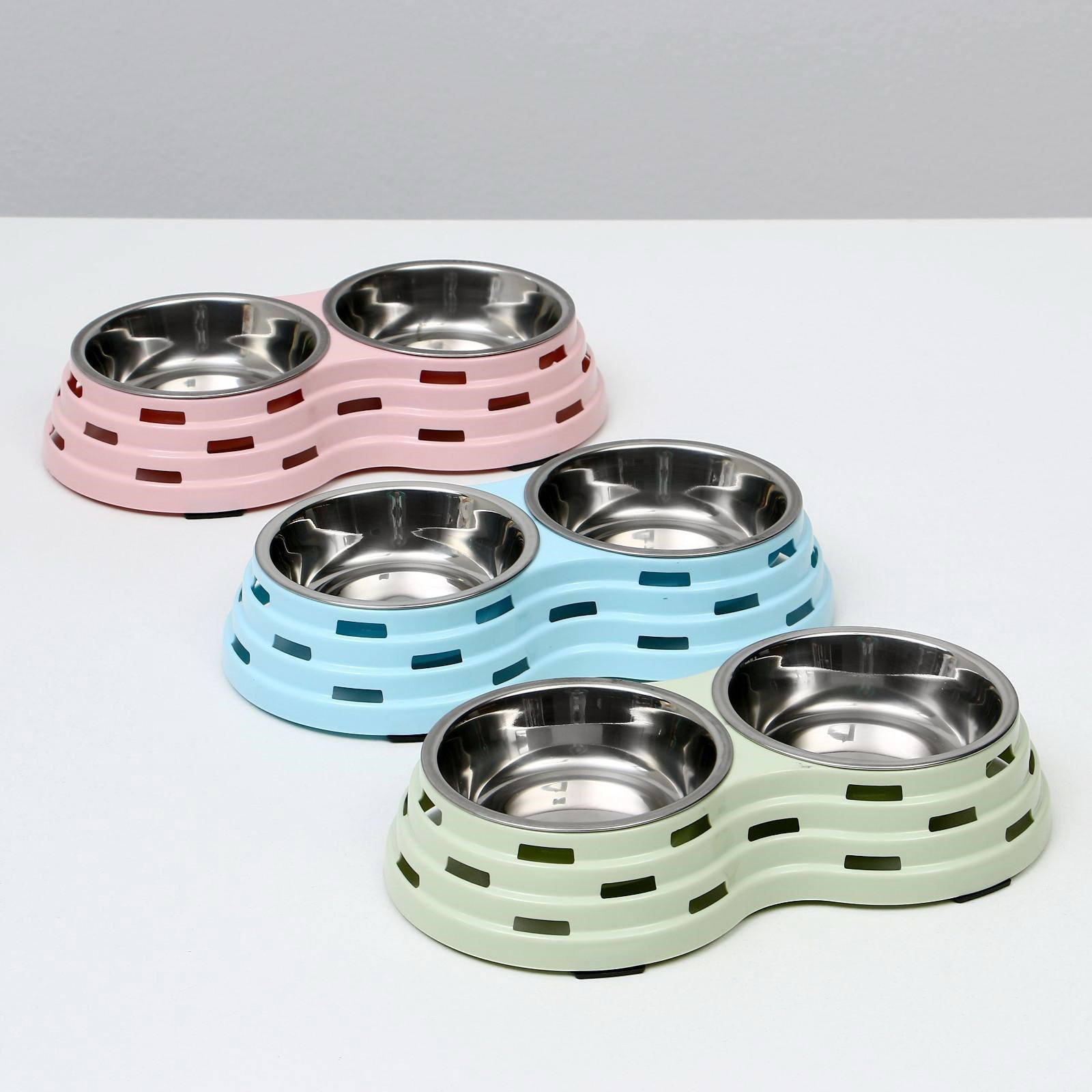 Миска металлическая двойная на пластиковом основании 2 x 160 мл, 25 x 14 x 5 см, зелёная, 14x25x5 см., Пижон, Китай