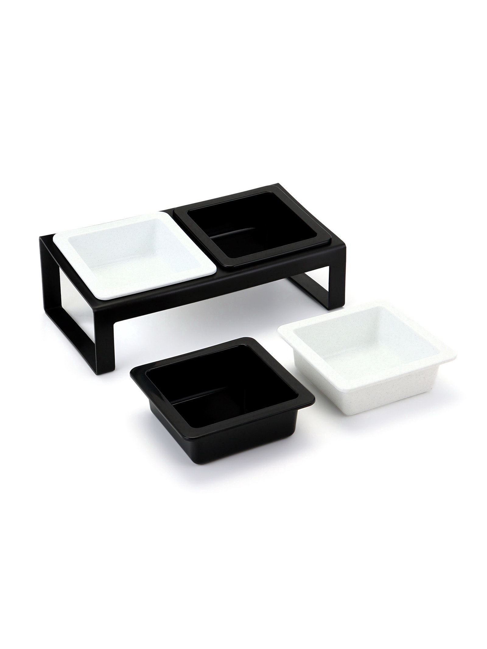 Цвет: Белый, Чёрный Назначение: Для кошек, Для собак Размер упаковки: 16 x 10 x 30 см. tnved: 3926909700 Температурное ограничение: Нет Рисунок: Нет Форма: Квадратная Особенности: На подставке/на ножках Вид: Двойная Порядок во время кормления и комфорт для питомца! Двойная миска на подставке "Квартет" с двумя дополнительными мисками в комплекте это практичное решение для организации питания кошек и собак. Комплект помогает содержать место кормления в чистоте и создает удобство для животного.