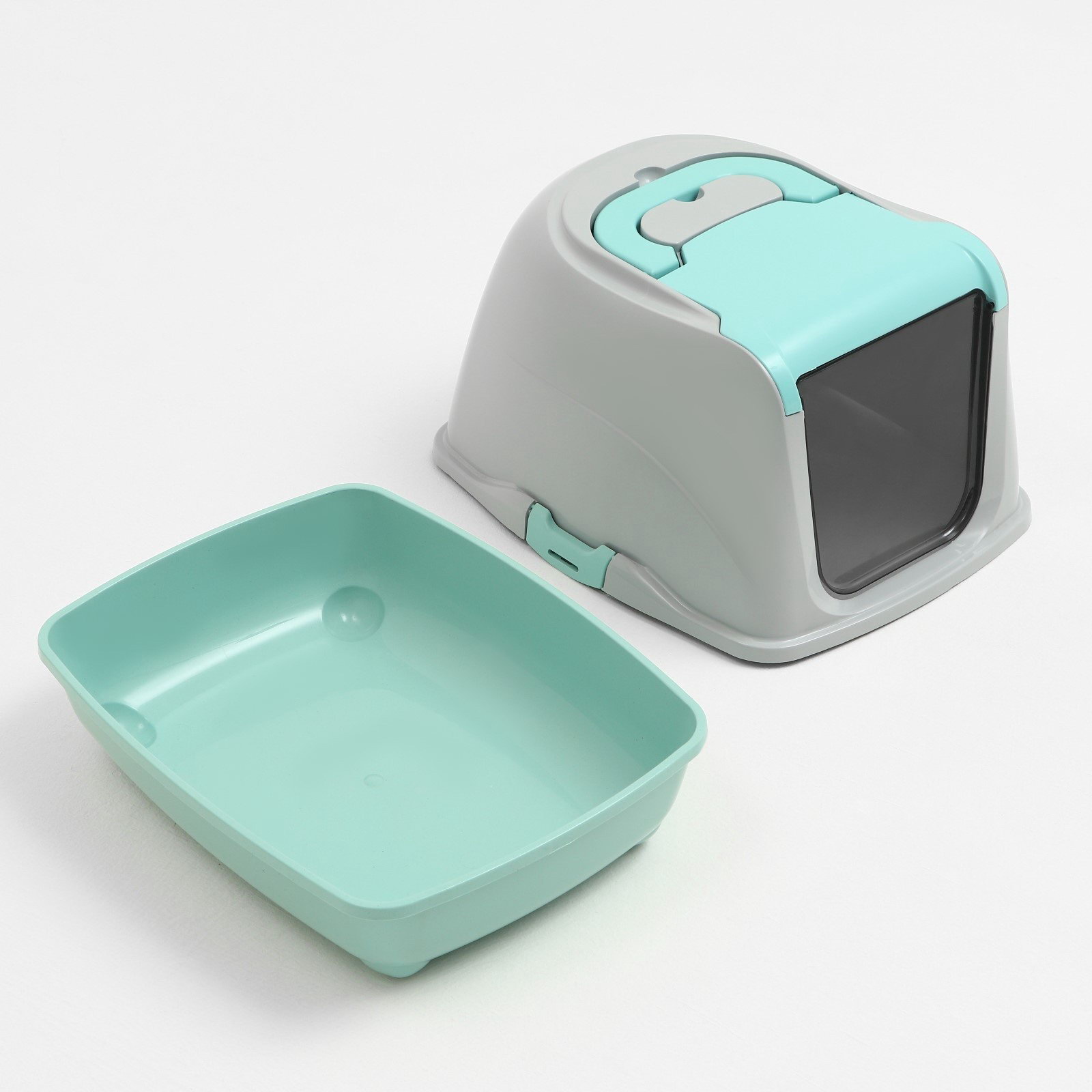 Туалет-домик для кошек закрытый с дверцей 50x38x37 см, бирюзово-серый, Пижон, Россия