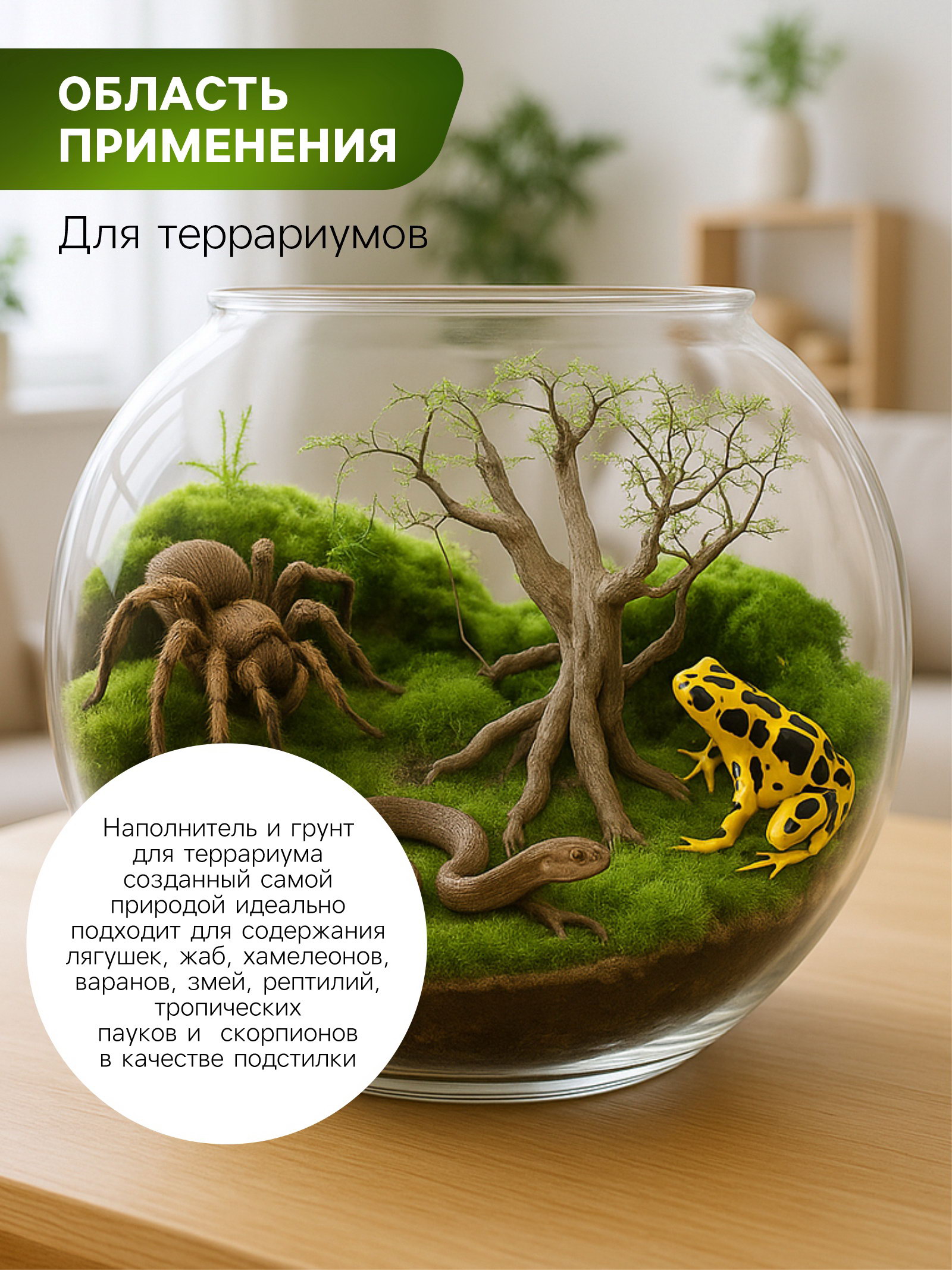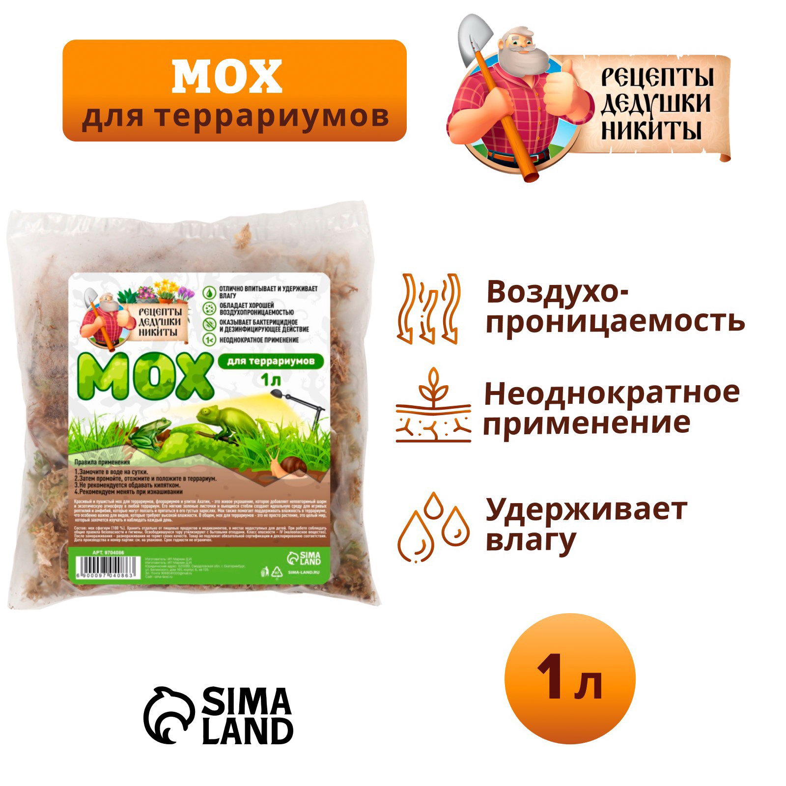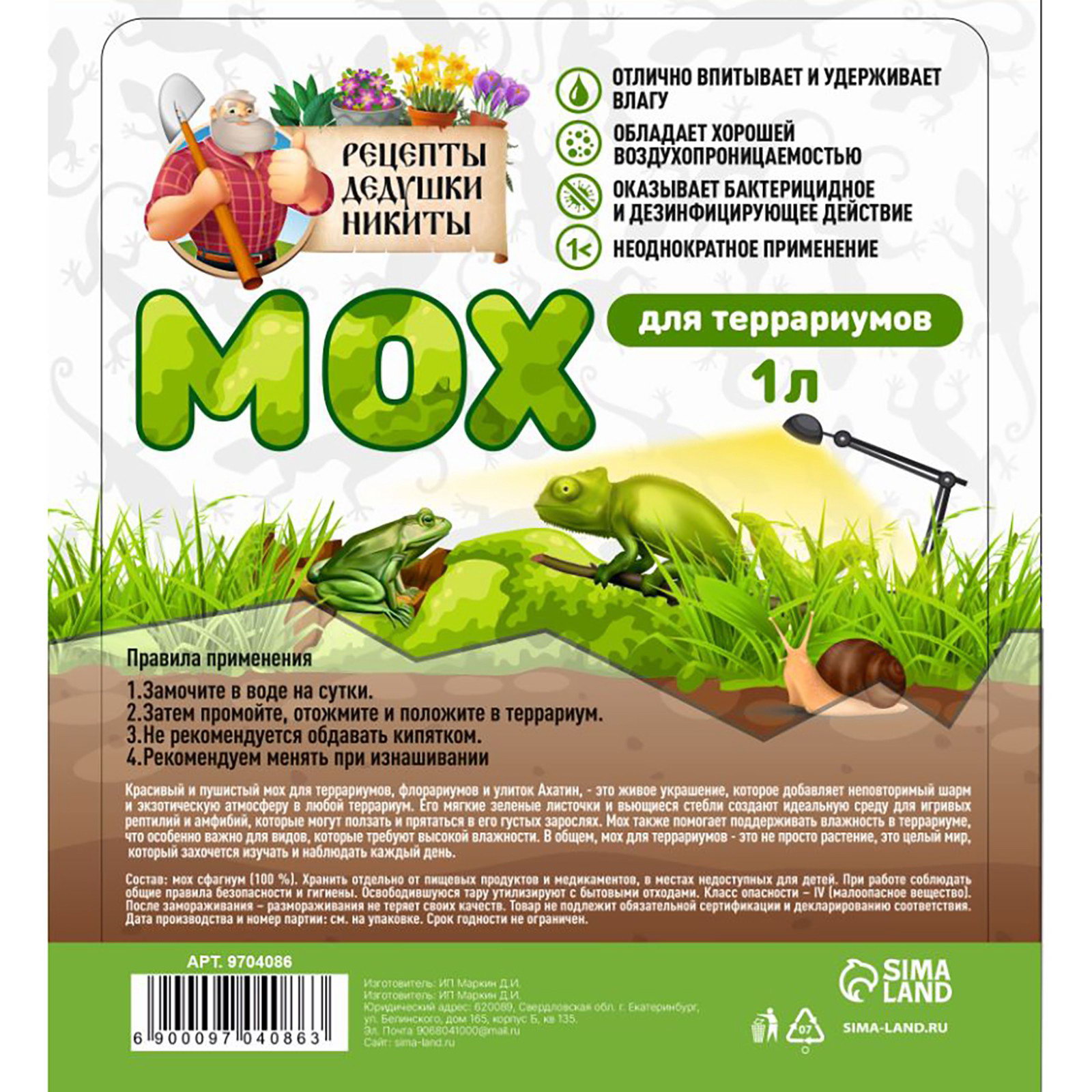 Размер упаковки: 18 x 4 x 18 см. Вес/Объём: 1 л Вес/Объём: 1 л tnved: 3105590000 Температурное ограничение: Нет Вид: Мох Мы предлагаем мох для террариумов, который поможет создать яркую и уютную атмосферу для ваших домашних питомцев. Мох сфагнум для террариумов Рецепты дедушки Никиты, не только добавит красоты и эстетического очарования в ваш террариум, но и обеспечит множество положительных качеств для животных. ?? Яркое и привлекательное оформление: имеет разнообразие оттенков и текстур, позволит создать уникальный дизайн вашего террариума. Добавит яркости и жизни в окружающую среду, создавая привлекательное место для обитания ваших питомцев. ?? Естественная среда обитания: имитирует естественные условия обитания животных. Это поможет вашим питомцам чувствовать себя комфортно и безопасно, создавая условия, близкие к их естественному окружению. ?? Увлажнение и регуляция влажности: Наш мох обладает отличными влагоудерживающими свойствами, что помогает поддерживать оптимальный уровень влажности в террариуме. Это особенно важно для животных, которым требуется определенный уровень влажности для здоровья и комфорта. ?? Создание убежищ и игровых зон: Мох может быть использован для создания убежищ и игровых зон в террариуме. Он предоставляет места, где ваши питомцы могут спрятаться, отдохнуть или исследовать окружающую среду. Это способствует их физической и эмоциональной активности. Инструкция по применению
