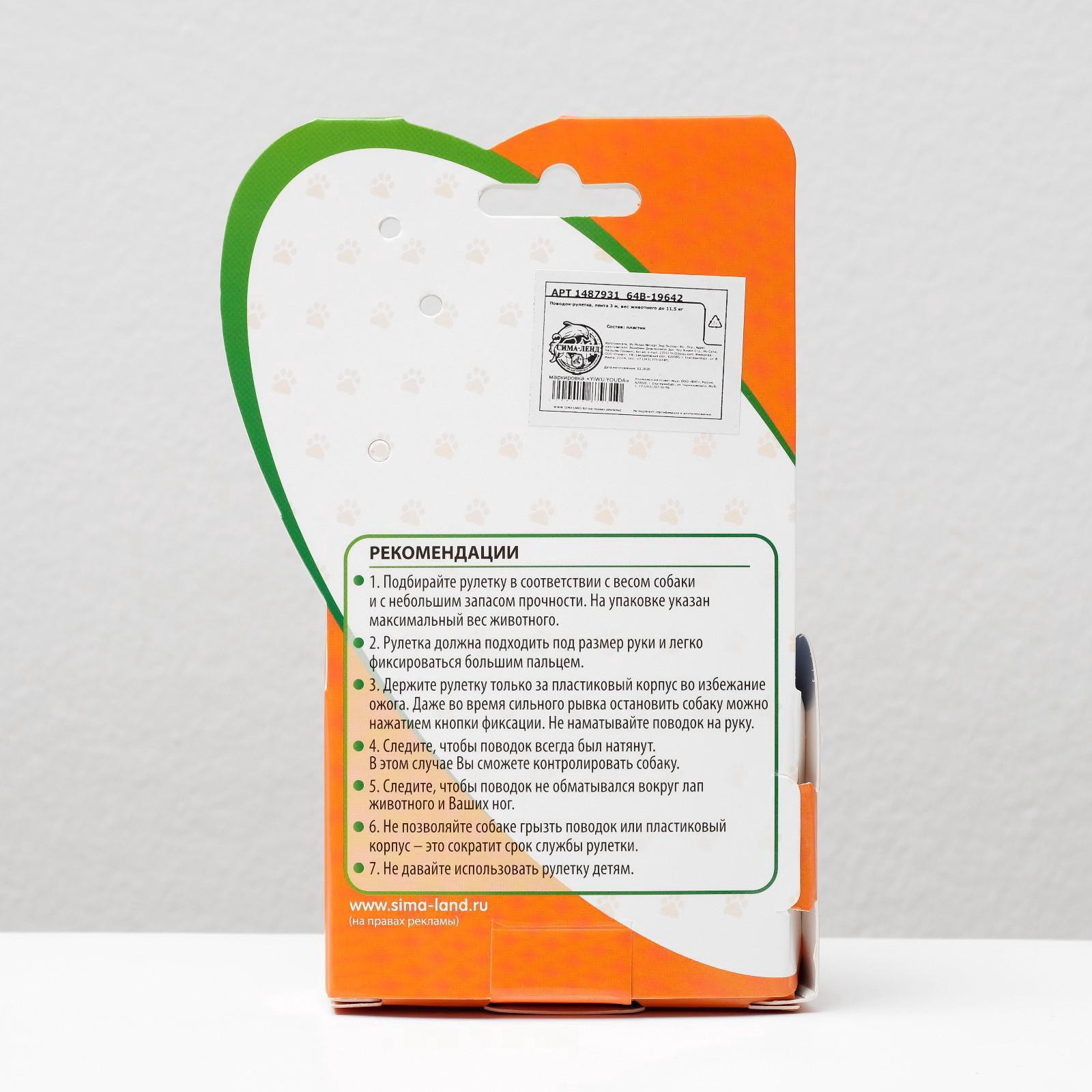 Размер упаковки: 9 x 2.8 x 15 см. Вид поводка: Лента Максимальный вес животного, кг: 11.5 Длина поводка, м: 3 Длина, м: 3 tnved: 4201000000 Цвет: Синий Рулетка "Молния" - это надежный и долговечный инструмент для прогулок с вашей собакой. Он имеет длину 3 метра, что оптимально для использования в городских условиях и на улицах с большим потоком людей. Рулетка рассчитана на собак весом до 11,5 кг. Рулетка имеет пластиковый корпус, который обеспечивает прочность и надежность при использовании. Лента, которая находится внутри корпуса, достаточно широка и прочная, что позволяет контролировать движения вашей собаки. Рулетка имеет стоп-механизма, поэтому приостановить движение ленты можно с помощью кнопки на ручке. Благодаря рулетке ваш питомец будет оставаться под контролем, и вы сможете спокойно гулять с ним на прогулке. Она легко помещается в кармане или сумке, поэтому вы можете брать ее с собой везде, где бы вы не находились. | ||