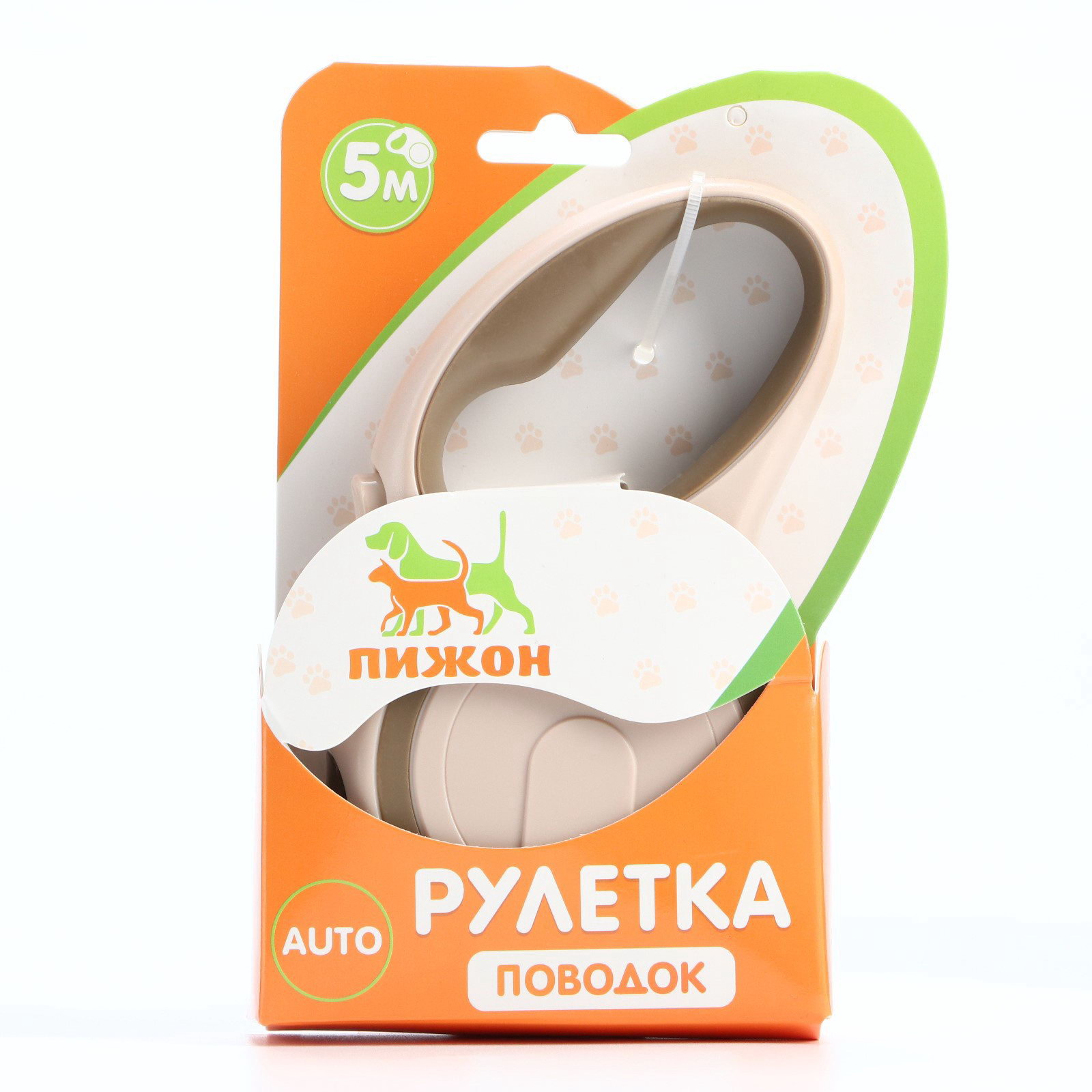 Рулетка с системой эффективного скручивания поводка, 5 м, до 20 кг, бежево-зелёная, 9.5x17.5x3.5 см., Пижон, Китай
