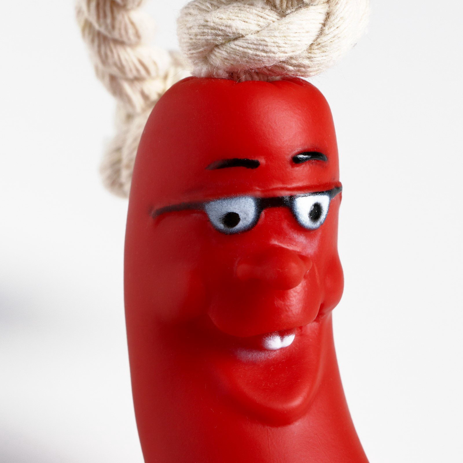 Игрушка для собак "Сосиска в очках на верёвке", 14 см, винил, красная, 14 см., Пижон, Китай